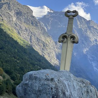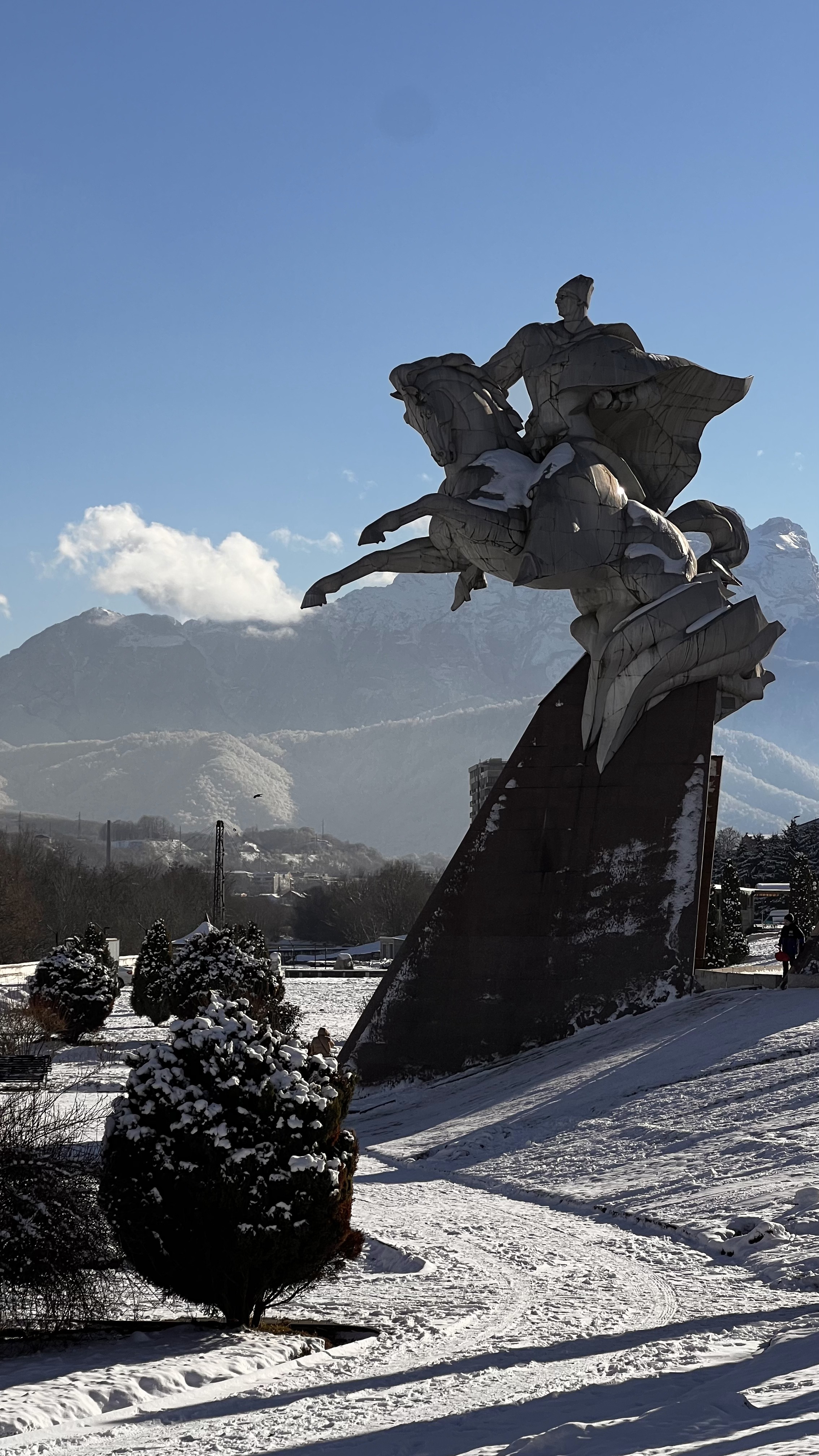Позавтракав в отеле мы выдвигаемся в Алагирское ущелье Осетии, где первой остановкой нас ждет гигантский монумент всадника на коне-Уастарджи, вмонтированный прямо в скалу! Уастарджи является местным святым, который защищает путников и воинов.