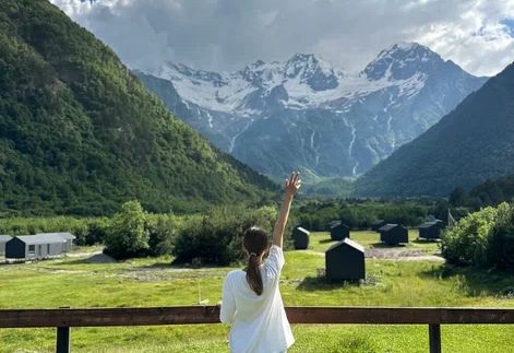 Поднимаемся по канатной дороге к леднику: внизу — крошечные деревья, горная дорога и крыши домов, а вокруг — только горы, тишина и прохладный воздух