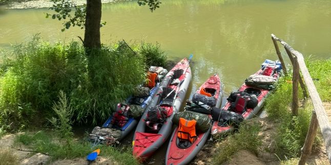 Просыпаемся, разминаемся, завтракаем, пакуем вещи и снова отправляемся в путь. Мы сплавляемся на байдарках по петляющей речке, предвкушая испытания, которые ждут нас впереди.