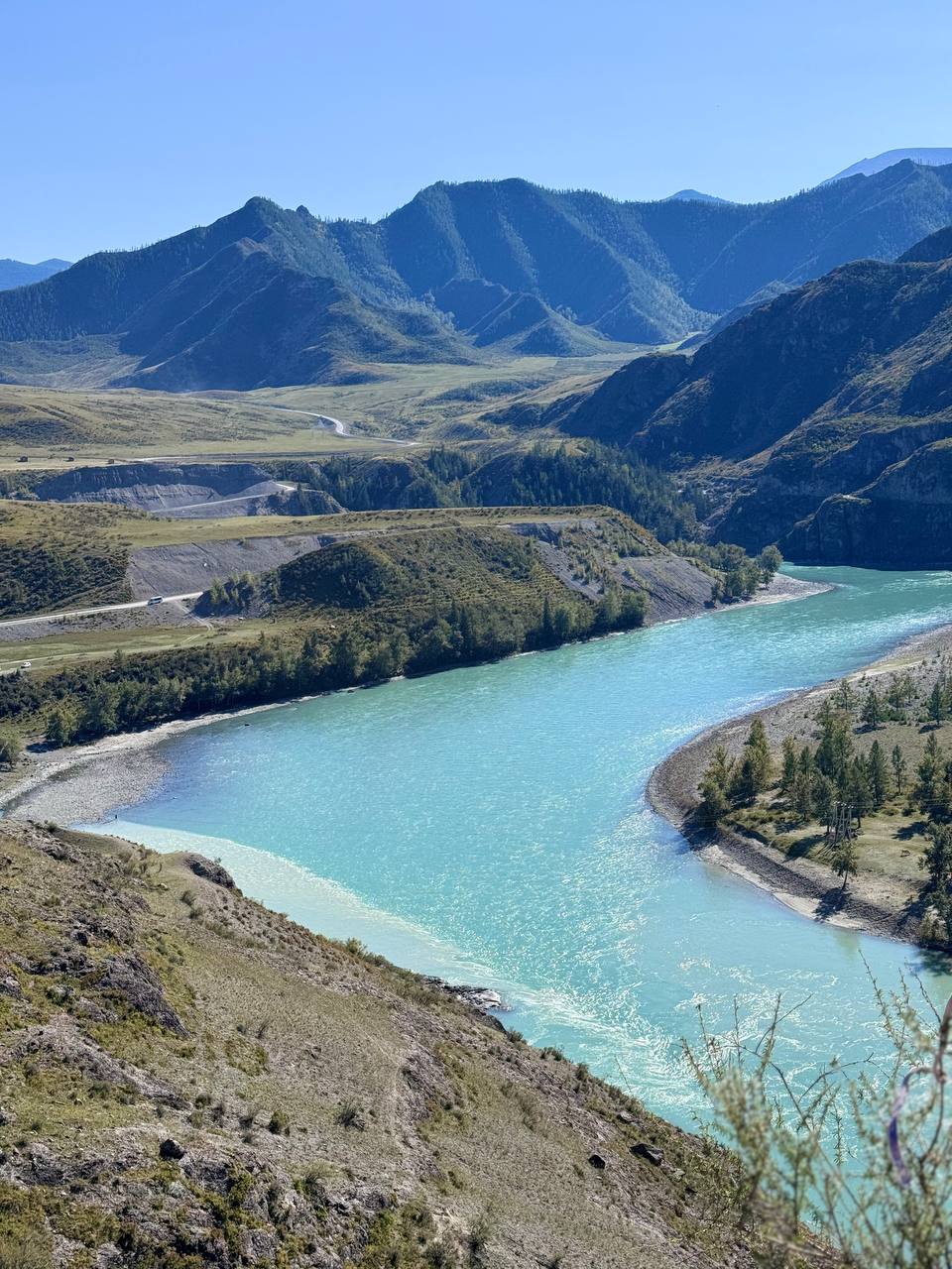 Слияние Чуи и Катуни: Остановка в месте силы, где сливаются две реки — серебристая Чуя и бирюзовая Катунь.