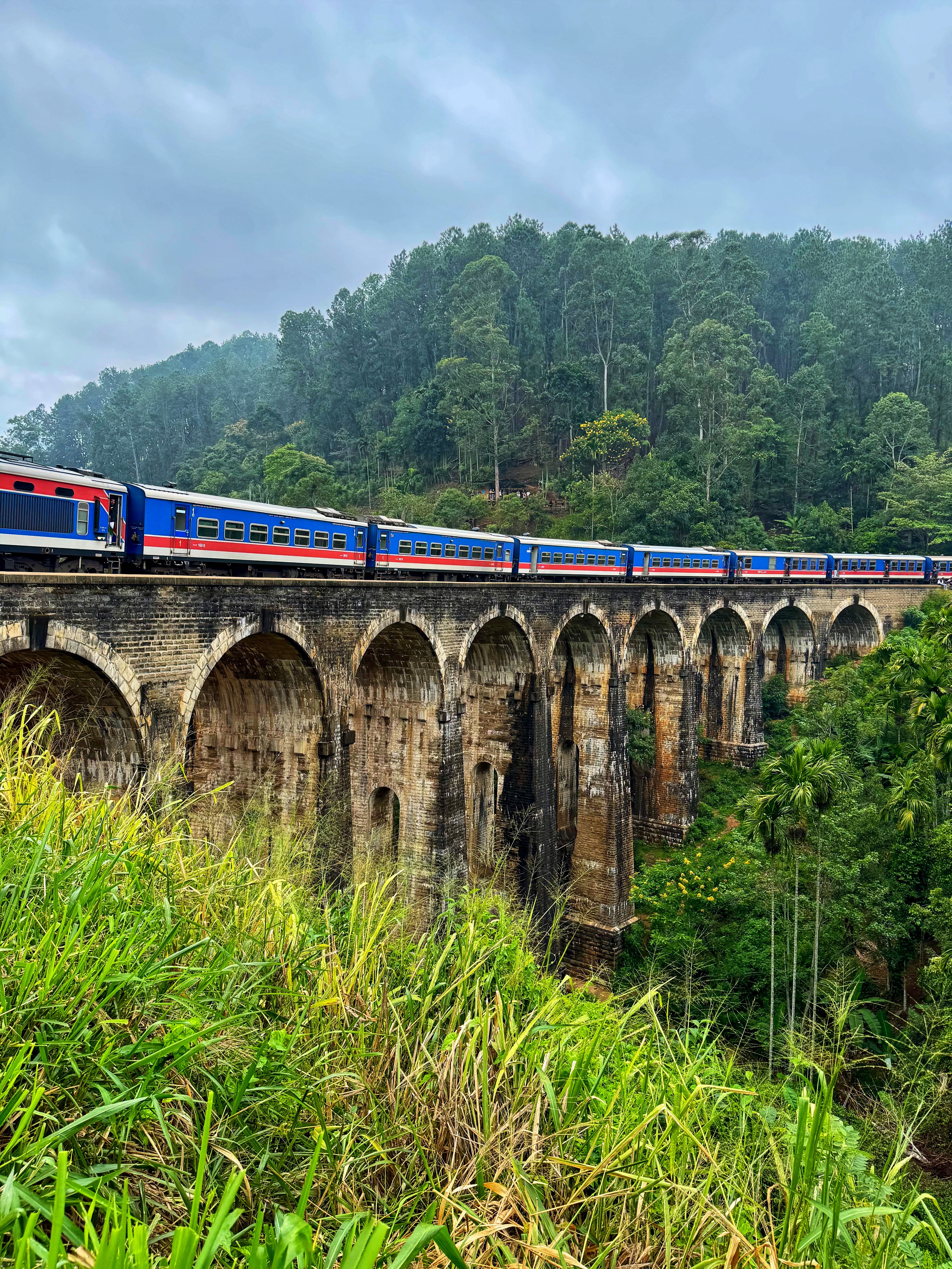 И постараемся поймать тот самый открыточный кадр: ярко-синий поезд, медленно пересекающий массивные каменные арки, утопающие в буйной зелени.