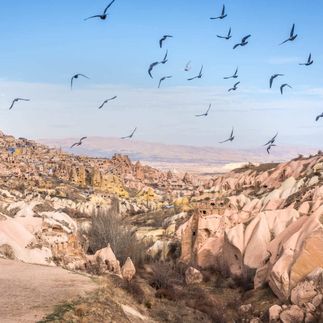 Наш экскурсионный день начнется с панорамной остановки в голубиной долине, или, правильней долине Голубятен. Называется она так потому, что в ней очень много скальных голубятен. Это одно из самых красивых мест Каппадокии. История этого необычного места уходит своими корнями во времена конца Xix - начала Xx века. Причиной создания голубятен был недостаток плодородных почв, а от голубей получали лучшее удобрение для виноградников. Долина представляет собой скопление скал с многочисленными тоннелями, окошками-гнездами голубей, которых там тысячи. На скалистых стенах можно увидеть различные рисунки в красно-синей гамме, которые наносились с помощью специального минерала для привлечения птиц. Голубей в Каппадокии очень ценят и в настоящее время, поэтому предпринимают различные меры по их защите от хищников.