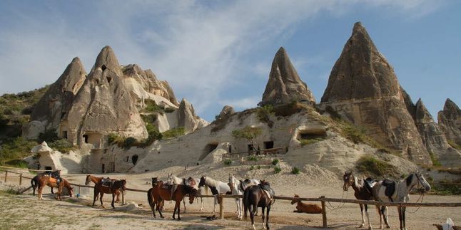 Смотровая площадка Три Красавицы - каменные столбы, носящие интригующее название Три красавицы, являются символом Каппадокии. Легенда гласит, что в этих камнях навеки застыли греческие богини Гера, Афродита и Афина. Располагаются статуи в таком месте, которое, любого, побывавшего здесь хоть раз, навсегда поражает своим бесподобным ландшафтом. Вся территория в округе практически усыпана оригинальными монолитами следами окаменевшей вулканической лавы, которая в течение долгих веков прошла обработку двумя самыми искусными мастерами дождем и ветром. Три красавицы из всех этих монолитов считаются самой известной композицией.