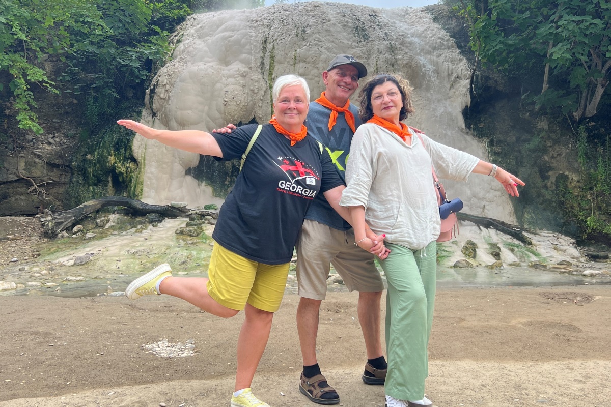 Едем к берегам реки Техури – там бьют горячие источники. Некоторые из них, вырываясь из-под земли, образуют травертиновые гроты, из них горячие воды текут к Техури, смешиваясь с ее прохладными водами. В природных бассейнах можно устроить себе контрастное купание – сначала в горячей воде, а потом в холодной).