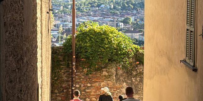 Вечером возвращаемся в Бергамо: фуникулёр поднимает нас в Citt Alta, и начинается прогулка по средневековым улочкам, аркам и уютным площадям.