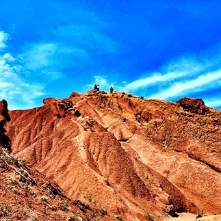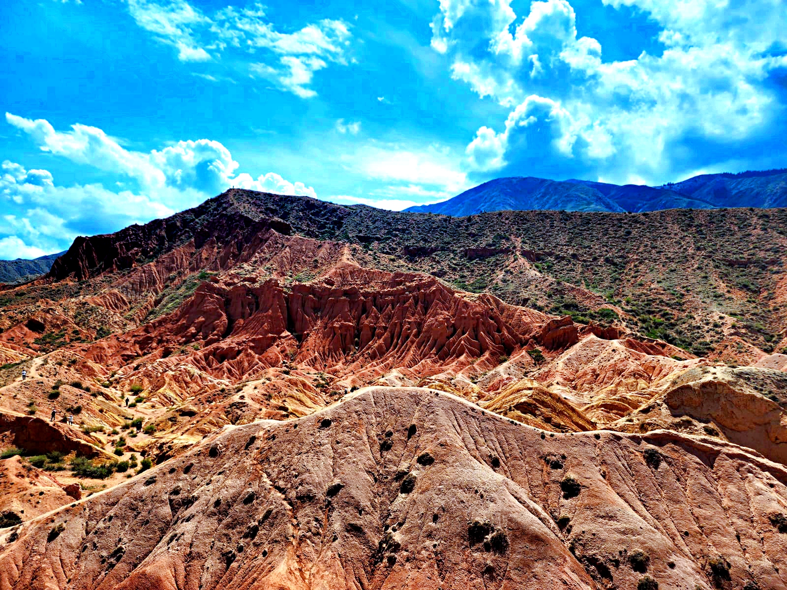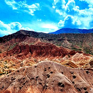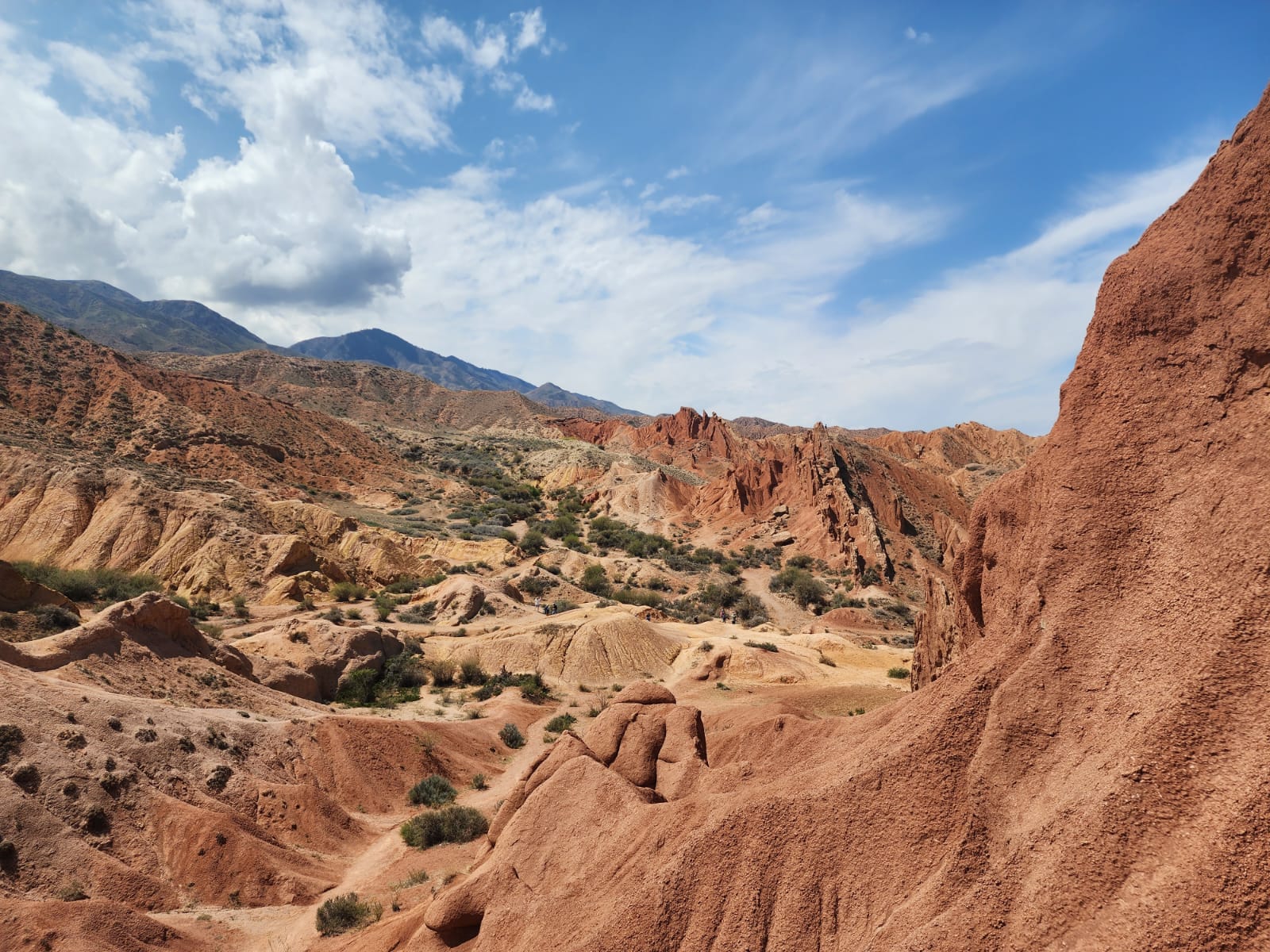 Здесь множество интересных рельефов и структур, созданных обилием осадков в течении долгого времени. А цветовая гамма поразит своей красотой. Взобравшись на самый верх, откроется потрясающий вид на озеро Иссык-Куль. С одной стороны красные горы, а за ними снежные пики и зеленые луга.