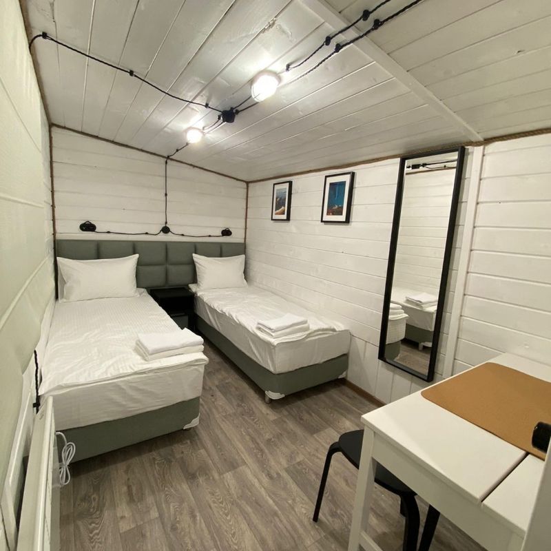 домики-кемпинги с собственным санузлом (площадь 12 м кв, 2 1-спальные кровати (можно сдвинуть, но без объединяющего матраса), фен, средства для душа), в домике нет wi-fi, есть в общем корпусе