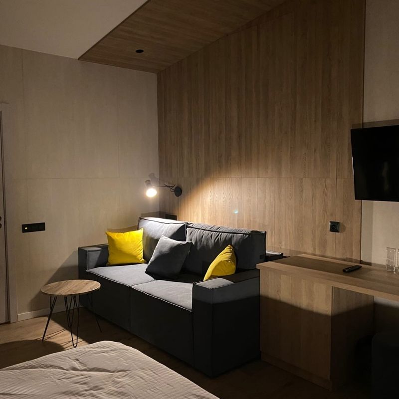 комфортные коттеджи с собственным санузлом и балконом (площадь 28 м кв, wi-fi, 1 2-спальная кровать или 2 1-спальные, доп.место диван (можно разместить 1-2 человек ростом до 170 см), кофемашина с капсулами, халаты и тапочки, средства для душа, холодильник, чайник, фен)