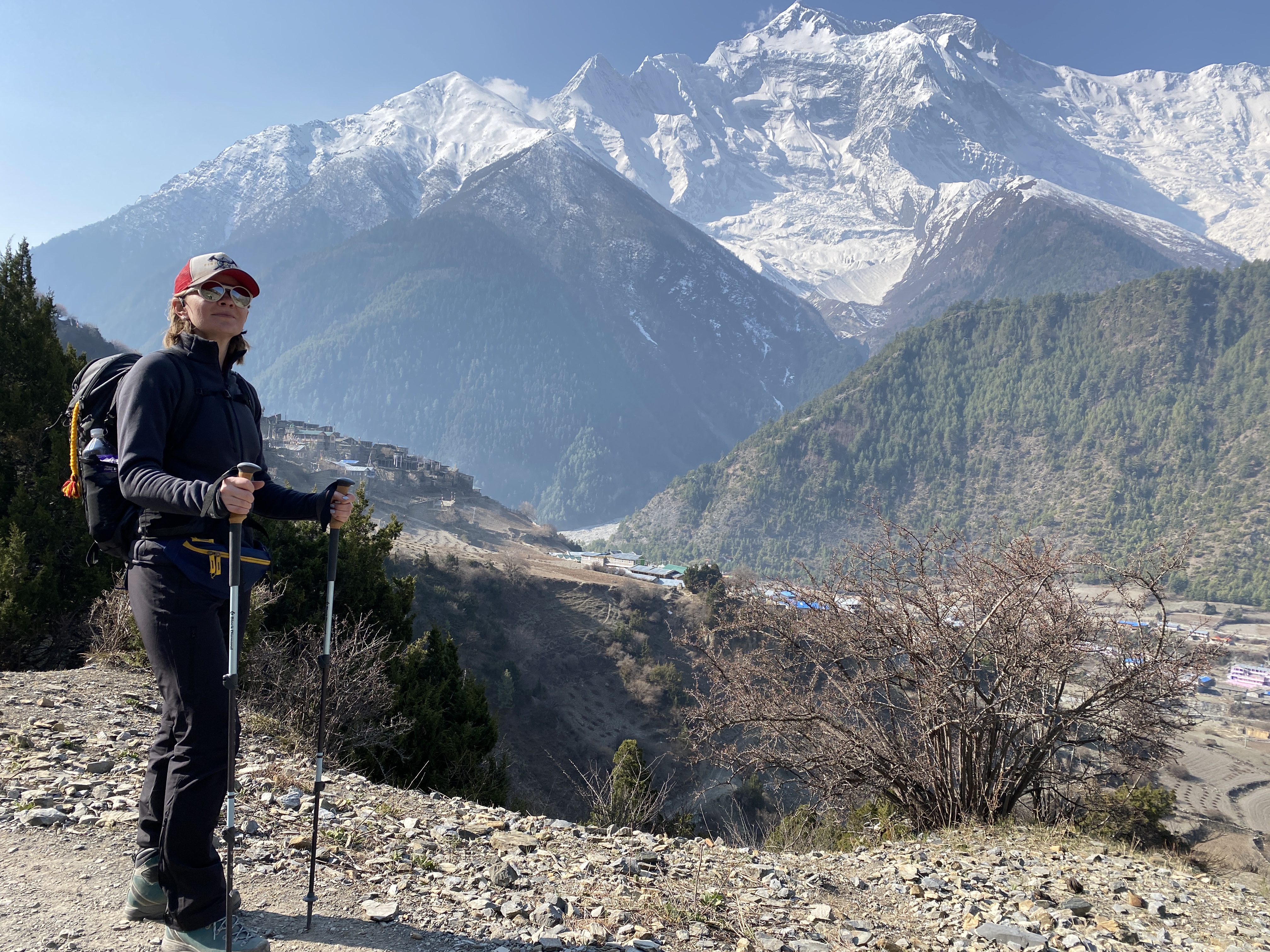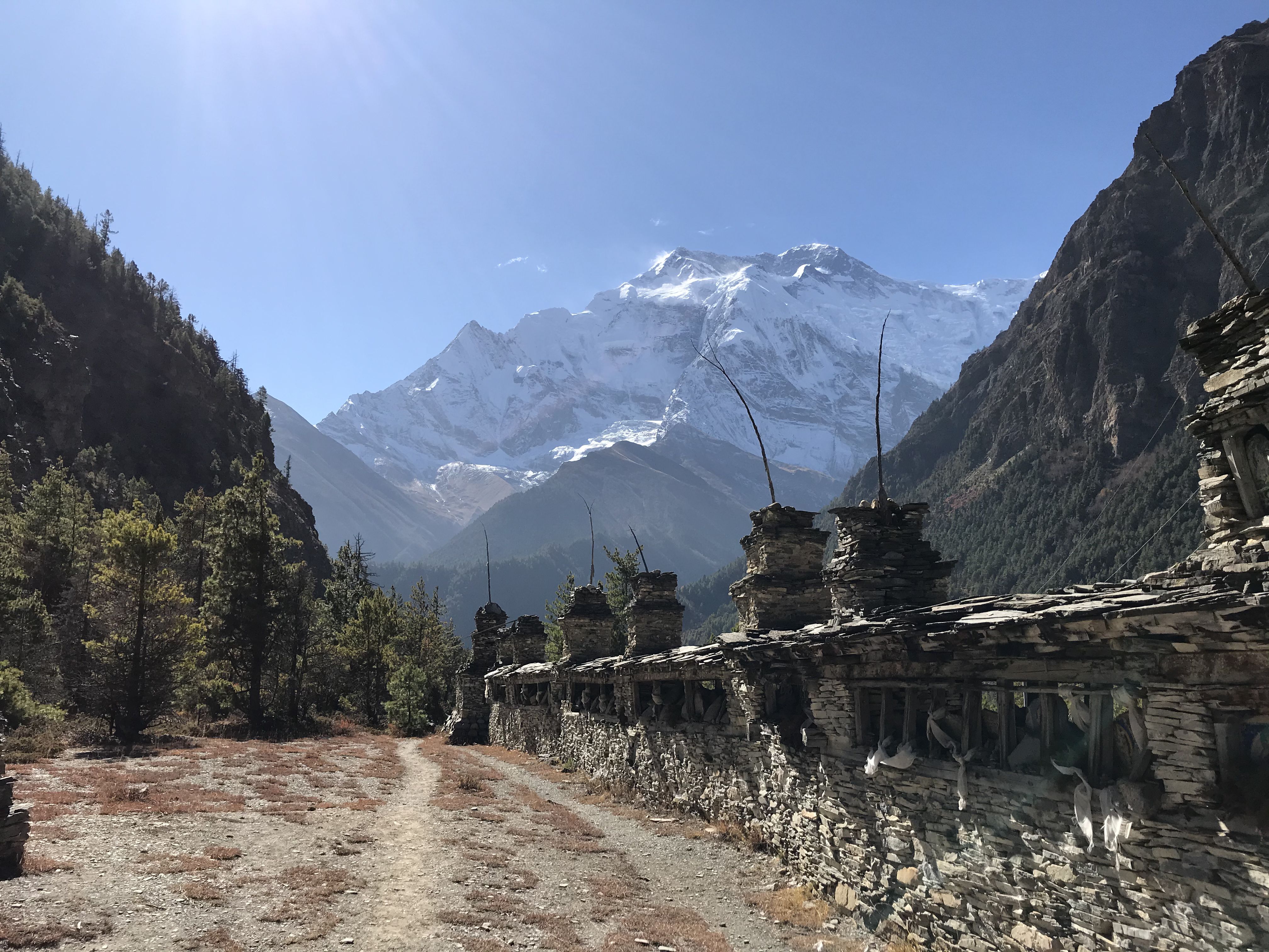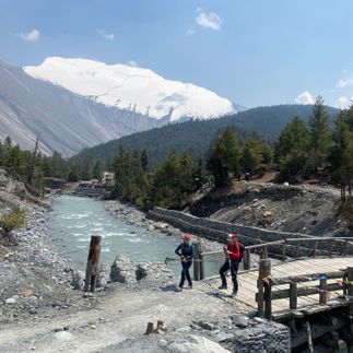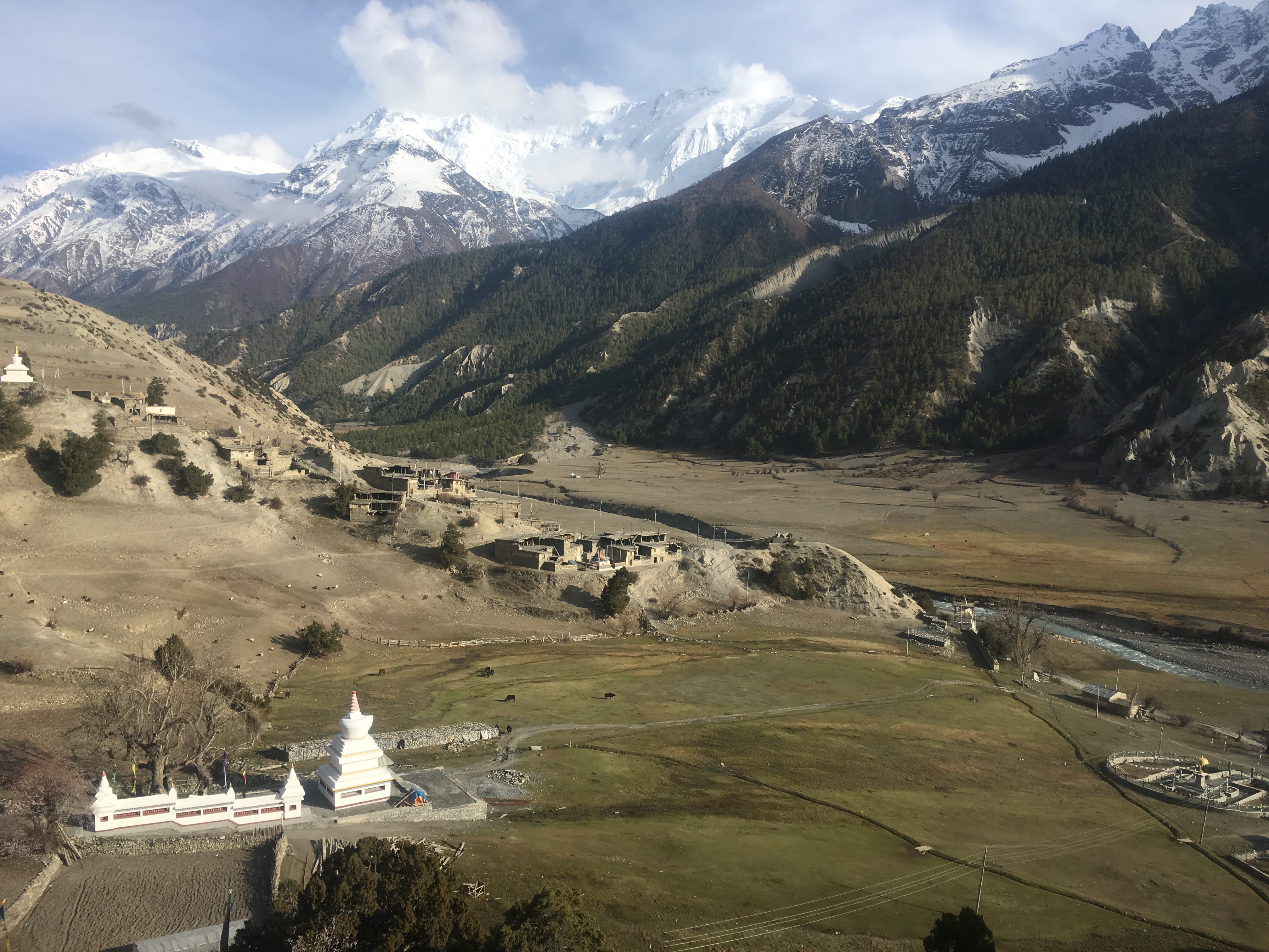 Пройдем по дороге вырубленной в скале. Пройдем по красивому хвойному лесу. И выйдем в широкую долину, окруженную вершинами Ламджунг Химал (6893 м) и отроги Аннапурны (в. Аннапурна-2 (7937 м) и Аннапурна-4 (7525 м), а с правой стороны долины пик Писанг (6095 м). Лазурная река будет течь вдоль долины, а вдоль нее мы увидим пастбища яков. Нам останется немного подняться до места нашего ночлега-,думаю, это самый видовой лодж на всем нашем пути.