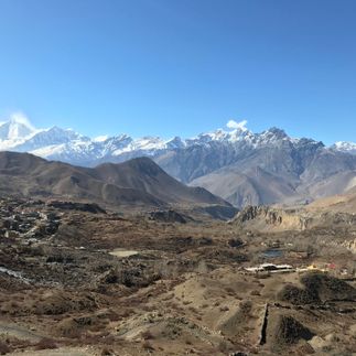 С утра, очень хорошо видно восьмитысячник Дхаулагири. Пейзажи сегодня совершенно фантастические и дорога проходит вдоль плато над рекой Кали Гандаки. Земля здесь похожа на Тибет, такая же дикая и безжизненная и, временами, чувствуешь себя в полной изоляции.