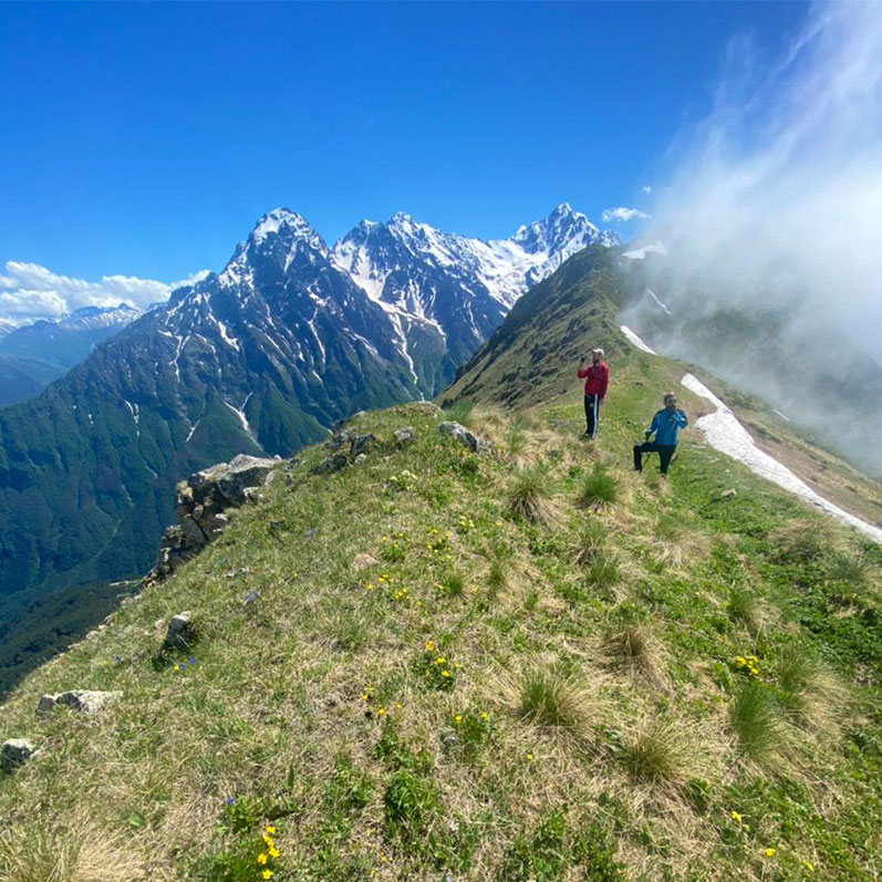 Пик Туриста.Предыдущие дни мы гуляли по каньонам и любовались горами и ледниками снизу, из долины. Пришло время посмотреть на ущелья Цей и Сказка с высоты птичьего полета!С утра отправляемся в ближайший поселок Верхний Цей и начинаем наш длинный подъем. В поселке посмотрим на родовые башни, а также издалека увидим на склоне горы еще одно святилище Реком. По пути в июле собираем чабрец, в августе лакомимся малинкой :)) и поднимаемся все выше и выше.У подножия горы Пик Туриста очень часто лежат облака. Но, как только оставляем их позади, сразу же открываются потрясающие панорамы! Гора Монах, сверкающий ледник Сказка, грозный ледник Цей и вдалеке, на горизонте, манящая вершина Грузии снежный Казбек.Активная часть прохождения по маршруту: 22,5 км, перепад высот 1710-2877 м, продолжительность треккинга 8-9 часов.