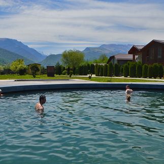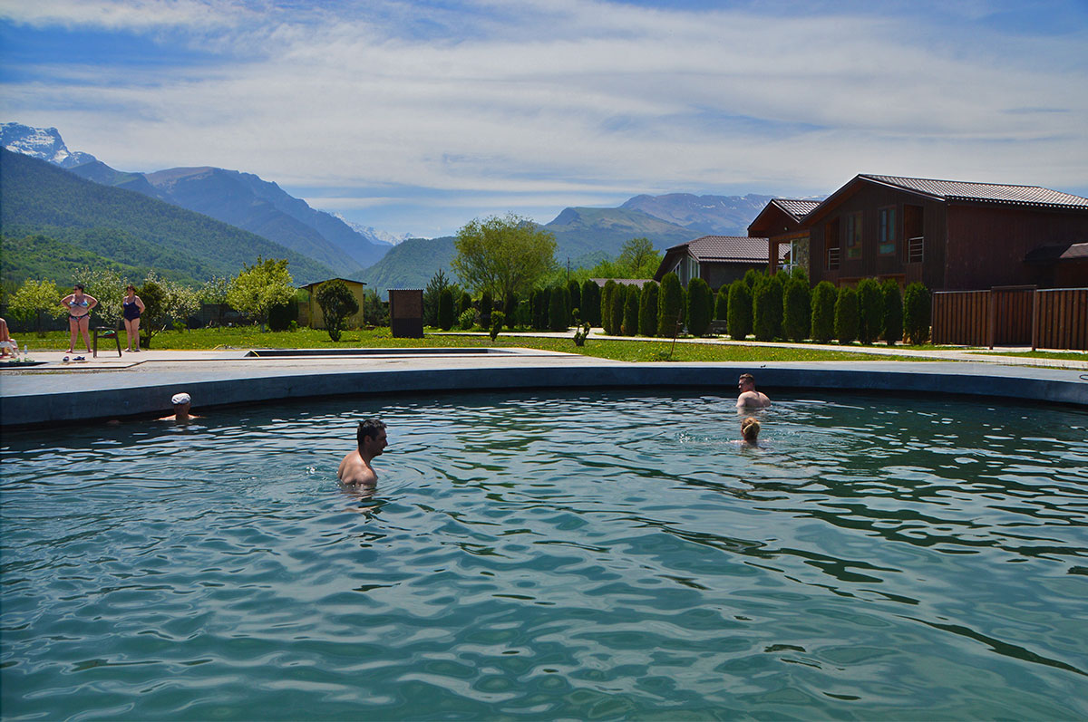 По пути заезжаем на термальные источники в с. Верхний Бирагзанг. Эти источники относятся к лечебно-столовым минеральным водам. Медики проверили состав воды и признали его полезным для укрепления здоровья.