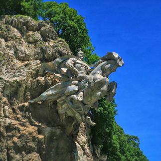 Далее в Алагирском ущелье увидим один из самых эффектных монументов Осетии летящего на коне Уастырджи. Он является покровителем мужчин, воинов и путешественников. Огромный, эффектный всадник на стальном коне словно пронзает насквозь скалу и вылетает на дорогу. Вес этой скульптуры - 28 тонн!! Это самый высокий конный монумент в мире!