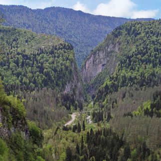 Встретив всех туристов, на автобусе отправляемся в горы! Дорога идет вдоль реки Бзыбь, мимо удивительных по красоте горных склонов, ущелий и водопадов. Вскоре увидим водопад Девичьи слезы: по известняковым скалам бегут вниз тонкие струи воды, появляющиеся прямо из камня. На скале под водопадом тут же привлекают взгляд сотни разноцветных ленточек, оставленных туристами. Далее по пути нас ждет живописное Голубое озеро и Юпшарский каньон великолепное ущелье, покрытое плющом, мхом и самшитами. Отвесные каменные стены Юпшарских ворот поднимаются вверх на 400 метров. Здесь всегда получаются очень эффектные фото!