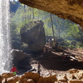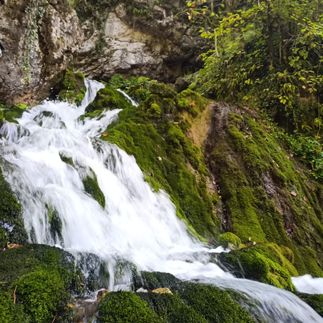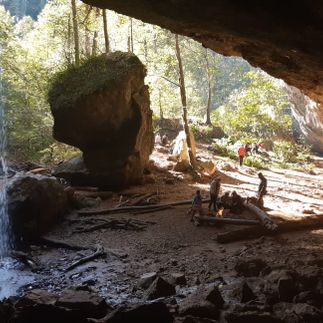 Далее тропа уведет нас за собой по сказочному самшитовому лесу к пещере Исиченко. Из пещеры вырывается мощный водопад! Вода здесь питьевая, очень чистая. От пещеры даже проложен водопровод, по трубам которого вода поступает в поселок Мезмай.