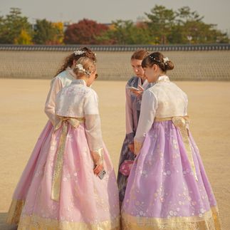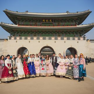 Утро начинается с дворца Кёнбоккун — фотографируемся в ханбоках и снимаем атмосферные видео. Контраст прошлого и настоящего здесь ощущается особенно остро.