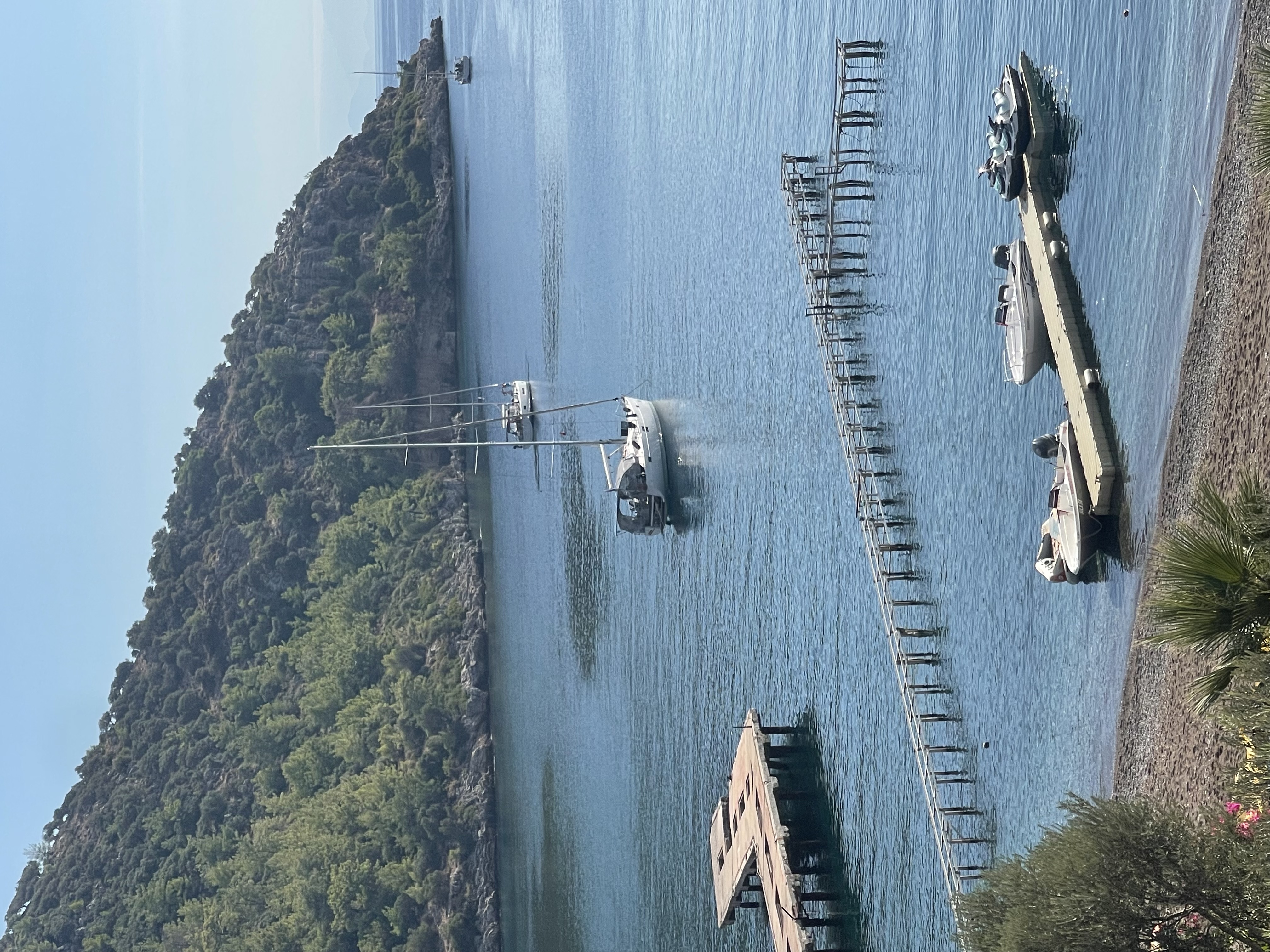 Воскресенье. Утро гости проводят неспешно. Кофе, чай, зарядка и купание. Завтрак. Примерно в 12-14 часов яхта отшвартовывается от острова Ичмелер и совершает переход (около 10 морских миль) в бухту Чифтлик. По пути следования знакомимся с несколькими бухтами, Турунч и Кумлюкбуку. Во время перехода желающие могут поработать с парусами и заняться троллингом Тунца. Дойдя до бухты Чифтлик швартуемся по Средниземноморски. Обедаем. Купание, сап серфинг, снорклинг. Вечером ужин. В этой бухте хорошая подводная охота. Так же можно осмотреть береговую линию, прогуляться. Есть пляж с черным песком и чистейшей водой.