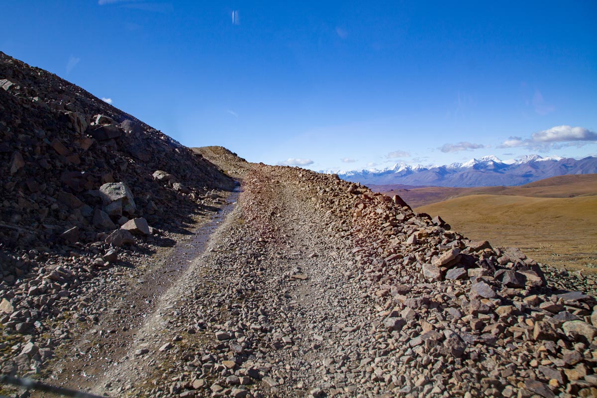 В 9 выезжаем из Кош-Агача. Проходим погранзаставу, двигаемся в сторону Укока, недоезжая до Джумалинских ключей, сворачиваем на старую дорогу. Проходим перевал Теплый ключ или Калгутинский, отсюда открываются виды на Южно-Чуйский,