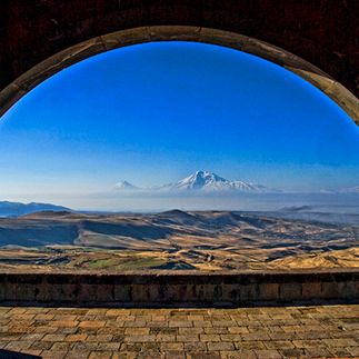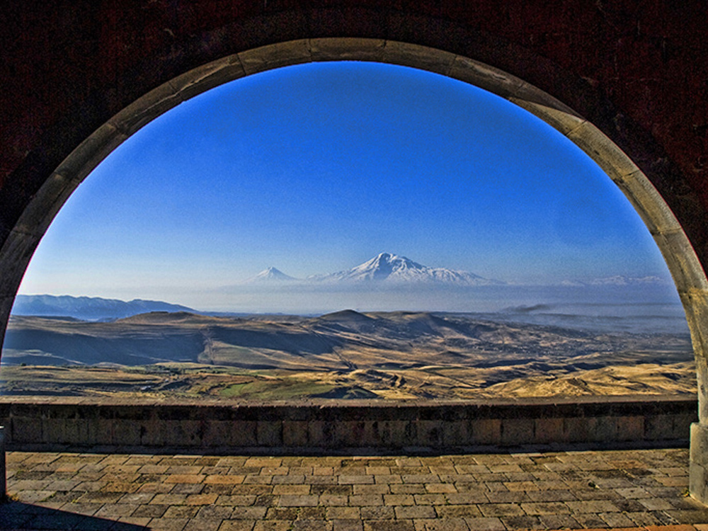 Арку Чаренца - излюбленное место туристов, откуда открывается потрясающий вид на священную гору Арарат, а издали виднеется город Ереван.
