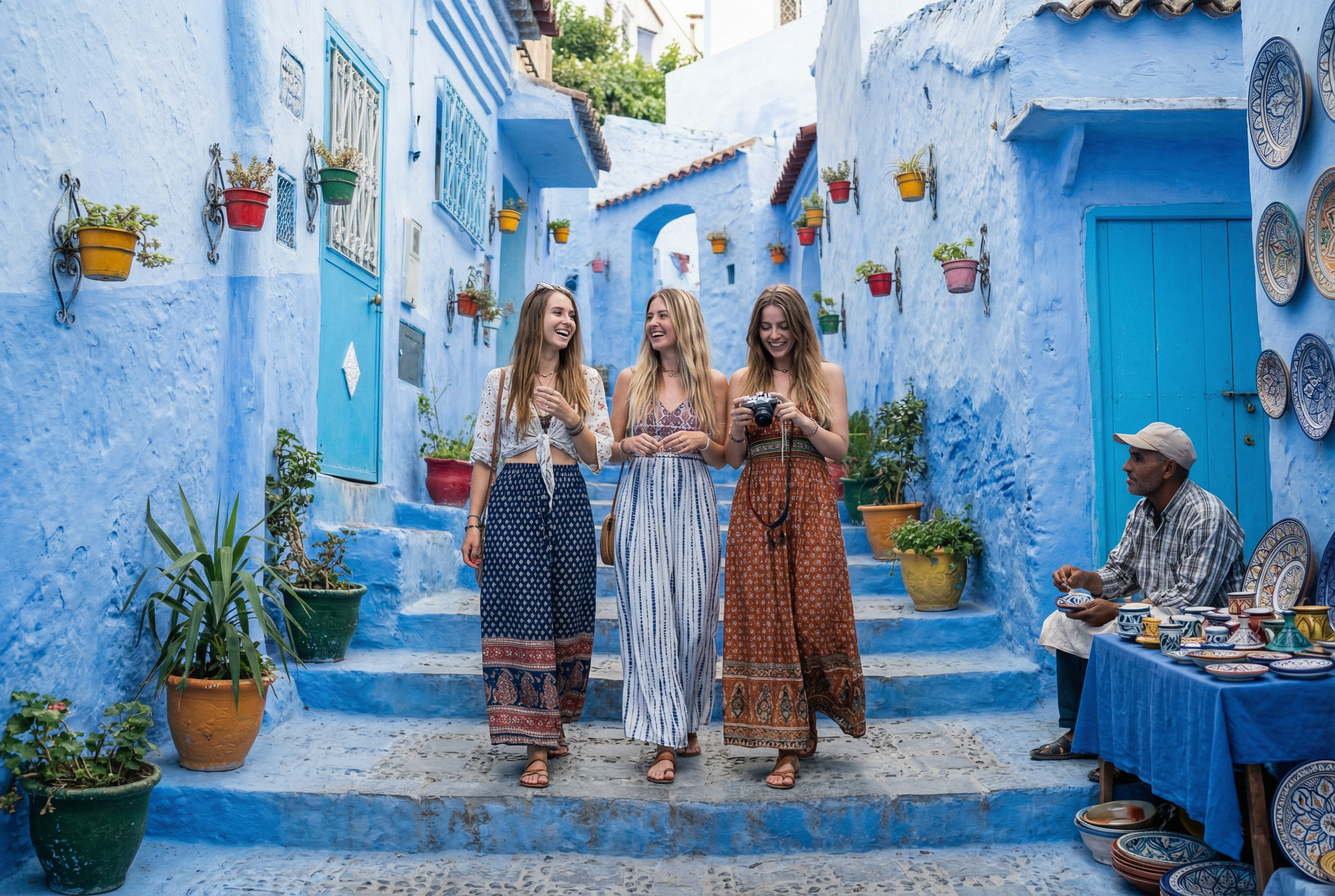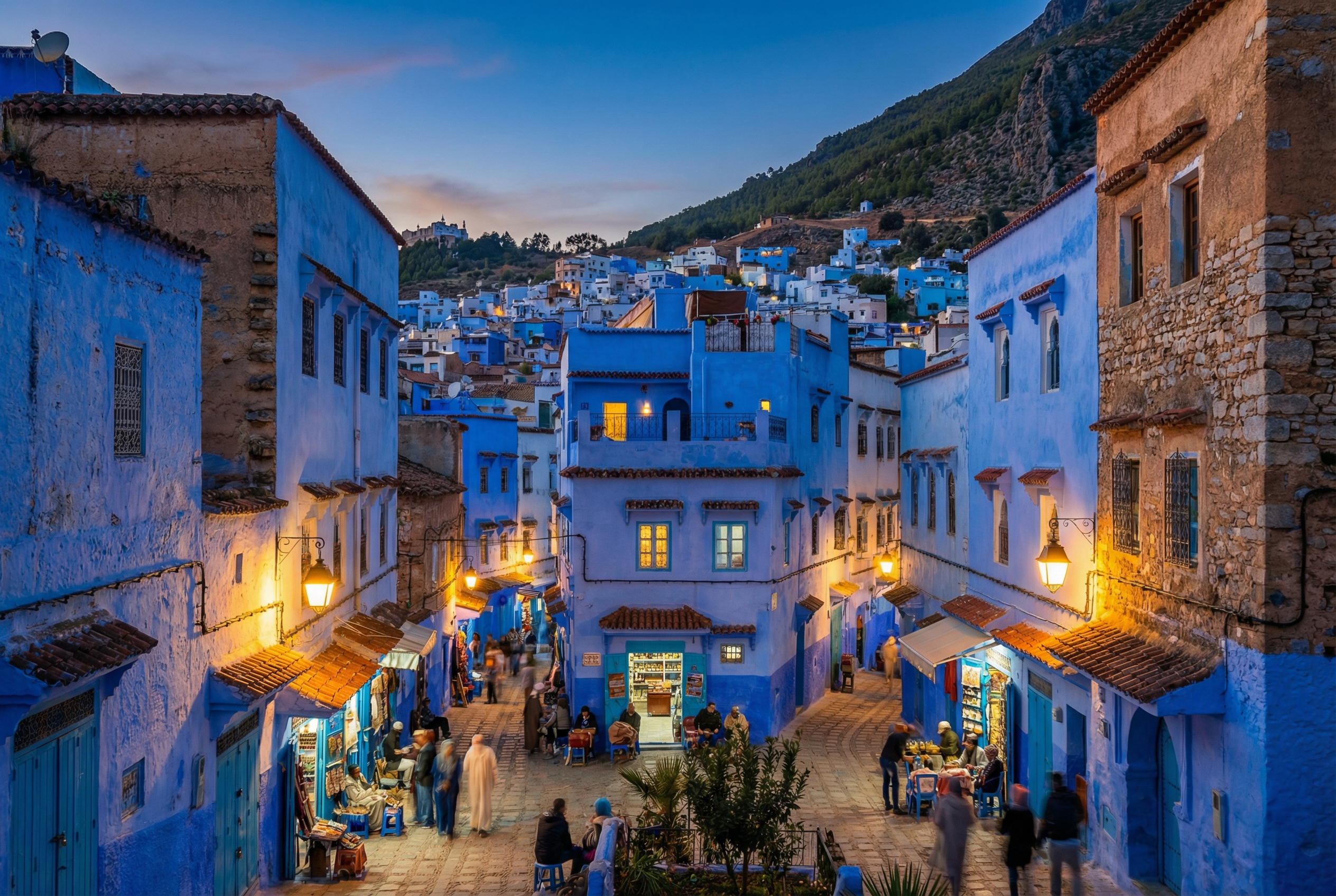 К вечеру мы приезжаем в Шефшауэн - город, в который влюбляются с первого взгляда. Голубые стены, тишина гор, тёплый свет фонарей. Заселение в риад и вечерняя прогулка — без маршрутов и спешки, просто наслаждаясь моментом.