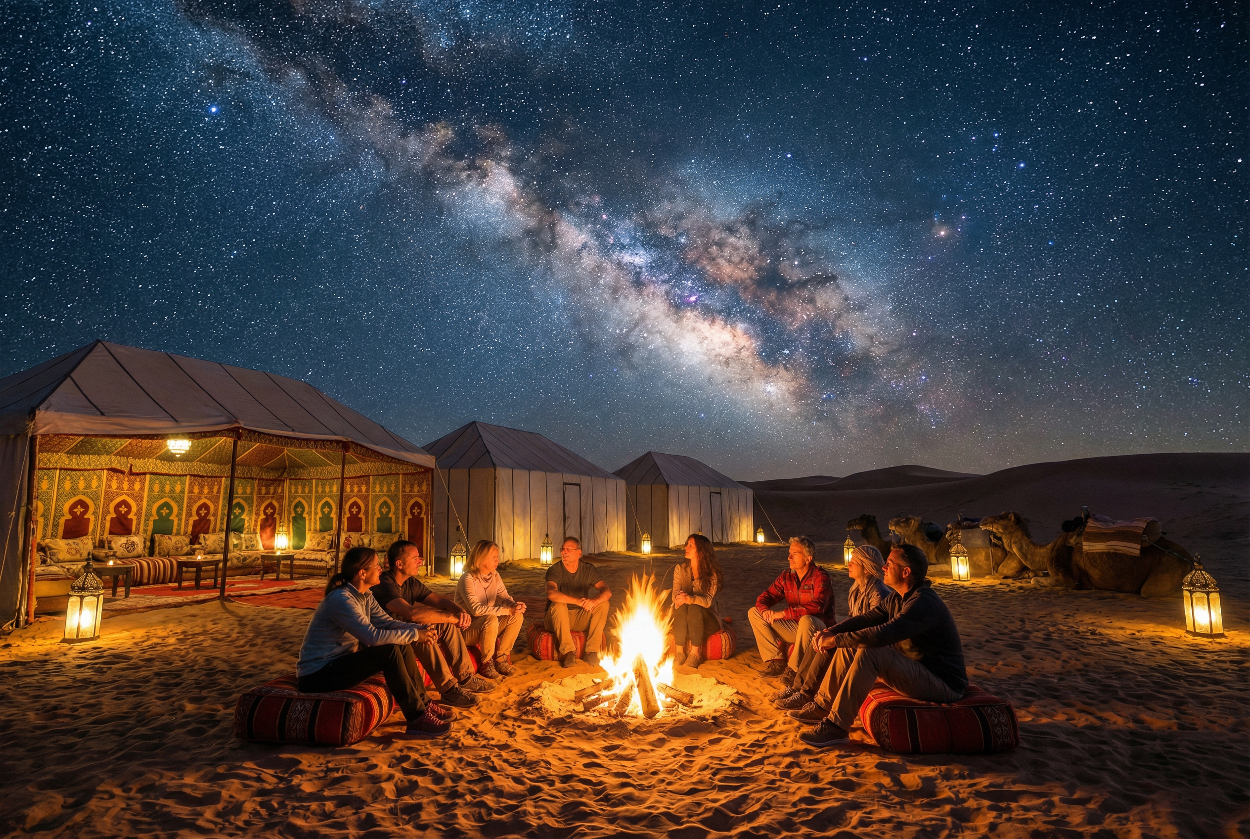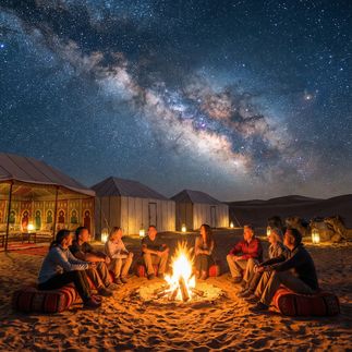 - Ночь в пустыне Сахара среди дюн с закатом и рассветом