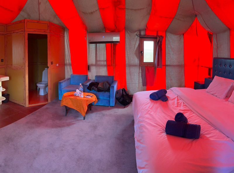 Ночлег в Комфортабельном Кемпинге: Ночуем в комфортабельном кемпинге в пустыне, где вас ждут все необходимые удобства, включая душ и туалет. Под звездным небом Сахары вы сможете насладиться танцами у костра и музыкой на марокканских барабанах, что сделает вашу ночь по-настоящему волшебной.