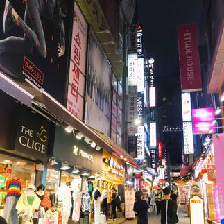 Гуляем по Мёндону: витрины сверкают, в воздухе запах жареных кальмаров и сладких вафель, в магазинах — корейская косметика, которую хочется попробовать прямо на месте. Первые шаги по Азии — и уже вау!