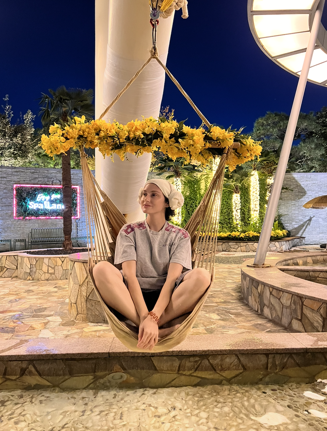 А вечером зафиксируем тотальное расслабление в корейском спа центре. Переоденемся в пижамки, накрутим смешную прическу из полотенца на голове и будем отдыхать в ваннах, где вода подается из горячих источников с глубины 1000 метров. Здесь больше 20 ванн, 13 различных саун и даже ванна под открытым небом. Помимо этого, можно побаловать себя массажем и получить необычный гастрономический опыт в местной раменной, где лапшу себе нужно собрать самим.