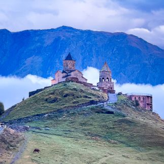 Мы встречаемся в аэропорту Владикавказа к 15:30, прилёт до 15:10, на ж/д вокзале Владикавказа в 15:30-16:30ч (в зависимости от крайнего прилёта). Более позднее время прилёта обсуждается! На общем трансфере едем в Грузию. Дорога займет около 2,5-3,5ч, в зависимости от дорожной ситуации и прохождения границы. По приезду, заселяемся в мини-отель с красивым видом на горы. Сегодня мы остановимся в посёлке Казбеги. Он расположен у подножия одноимённой горы Казбек и окружен вершинами со всех сторон. Главная активность сегодняшнего дня - подъём на подготовленных джипах к Храму Гергети на высоте 2170м. Он гордо возвышается над поселком и окружающими его горами.