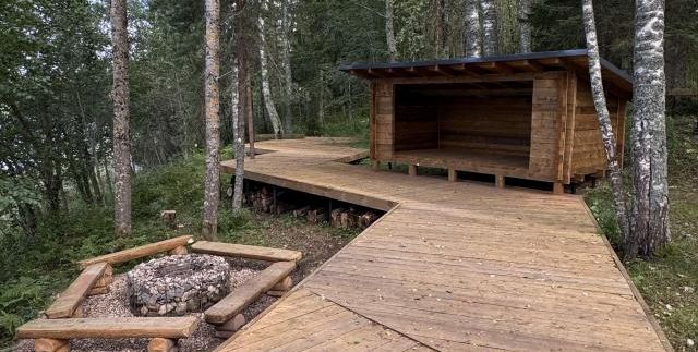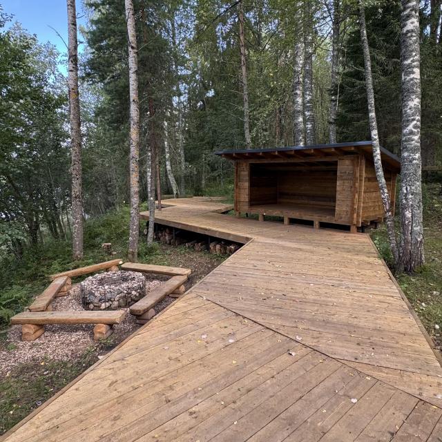Разбиваем лагерь на новой красивой каскадной стоянке на озере Середейское. Желающие попробовать дикий сон без палатки могут заночевать в специально постройке - финской лааву. Такие беседки широко распространены на туристических маршрутах в скандинавских странах.