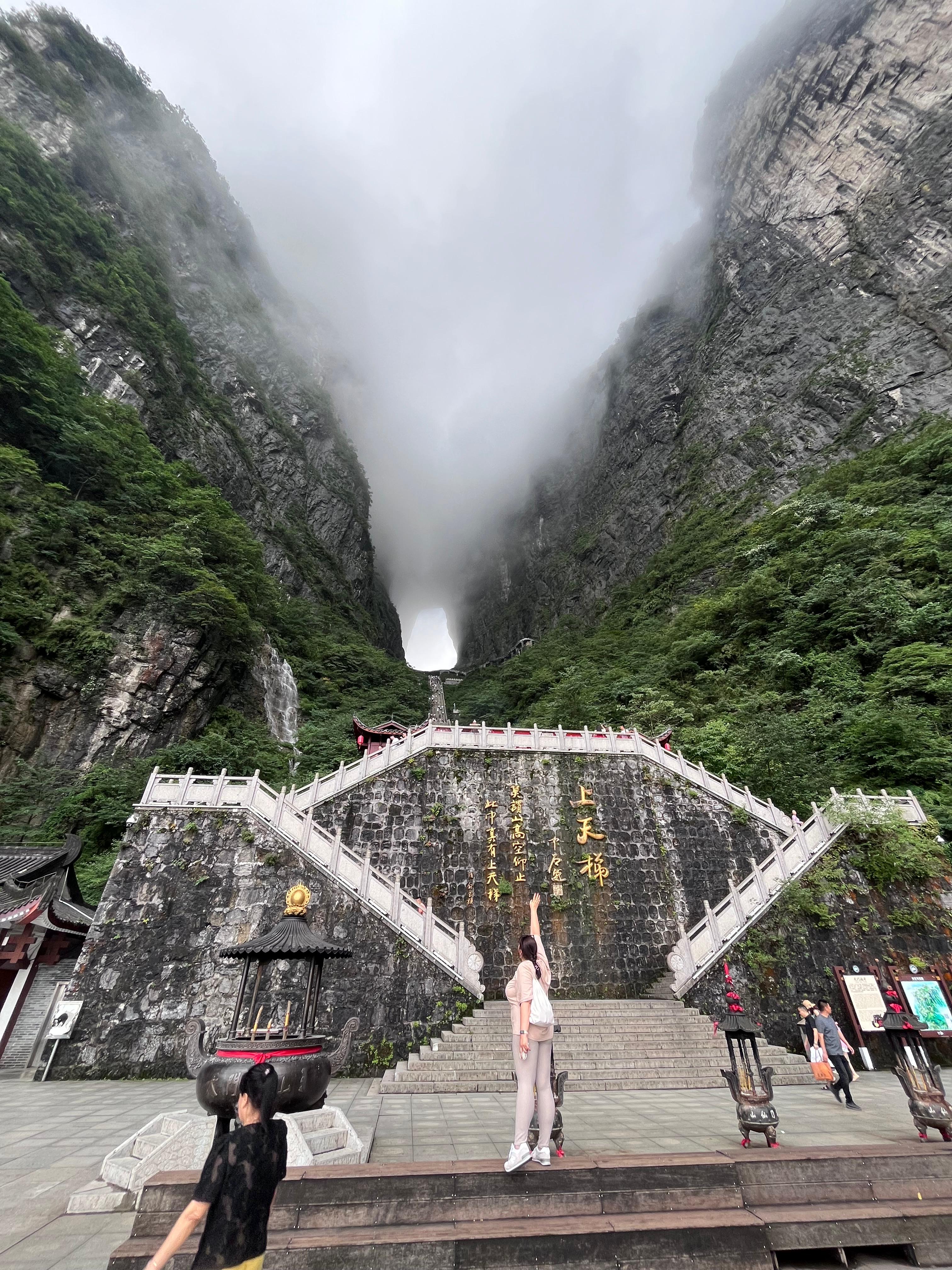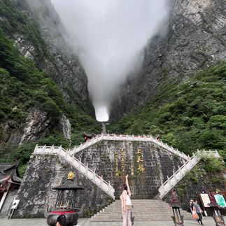 Освобождаем номера и в сопровождении гида отправляемся к еще одному фантастическому месту национального парка Чжанцзяцзе - горе Тяньмэньшань Гора Небесные ворота. Гора имеет высоту 1518,6 м. Небесные ворота огромная сквозная дыра в скале, делает облик горы узнаваемым и уникальным. Эту пещеру называют волшебной пещерой Западной Хунани. Она образовалась в 263 году, когда большой кусок горы просто отвалился, создав огромную полость высотой 131,5 м, шириной 57 м в самом широком месте и длиной 60 м. Окутанные облаками, Небесные ворота действительно очень впечатляют: кажется, что, пройдя через них, вы действительно окажетесь где-то в иной реальности.