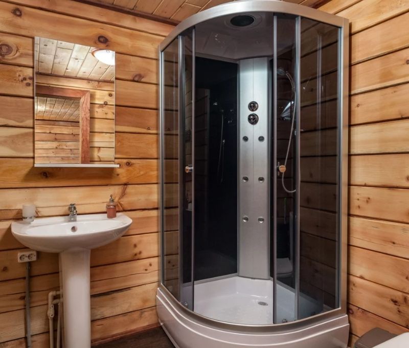 На турбазе «Пирс» часть домиков оборудована санузлом прямо внутри домика, а в некоторых он выполнен в виде пристройки — чтобы попасть туда, нужно выйти из комнаты и сделать буквально один шаг до отдельного входа в туалет и душ.