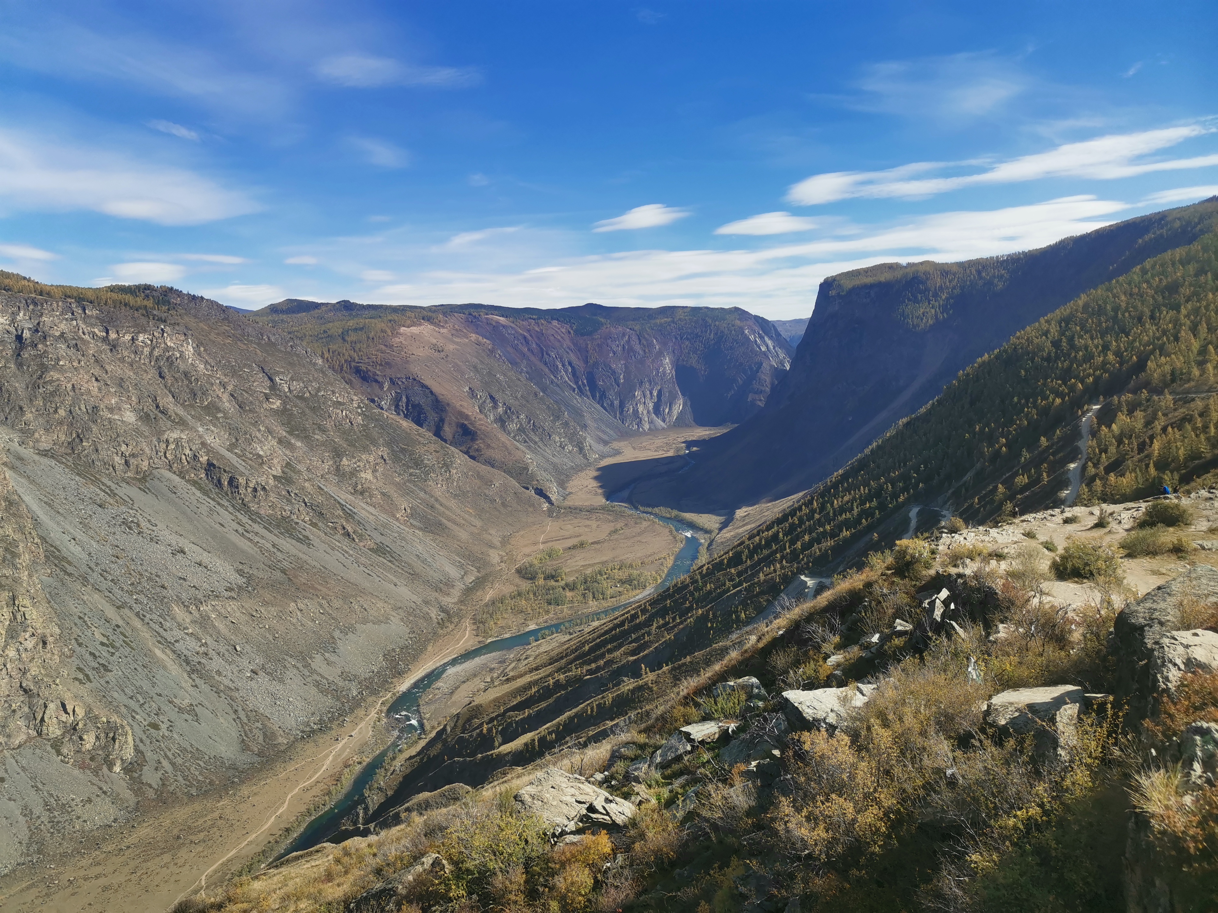 Сегодня походим пешком. После завтрака загружаемся в наш проходимый бус и проезжаем по горным грунтовым дорогам до места старта нашего радиального выхода. А идем мы вдоль реки Катунь до места впадения в нее суровой реки Аргут, на которой расположен самый сложный речной порог в горном Алтае.