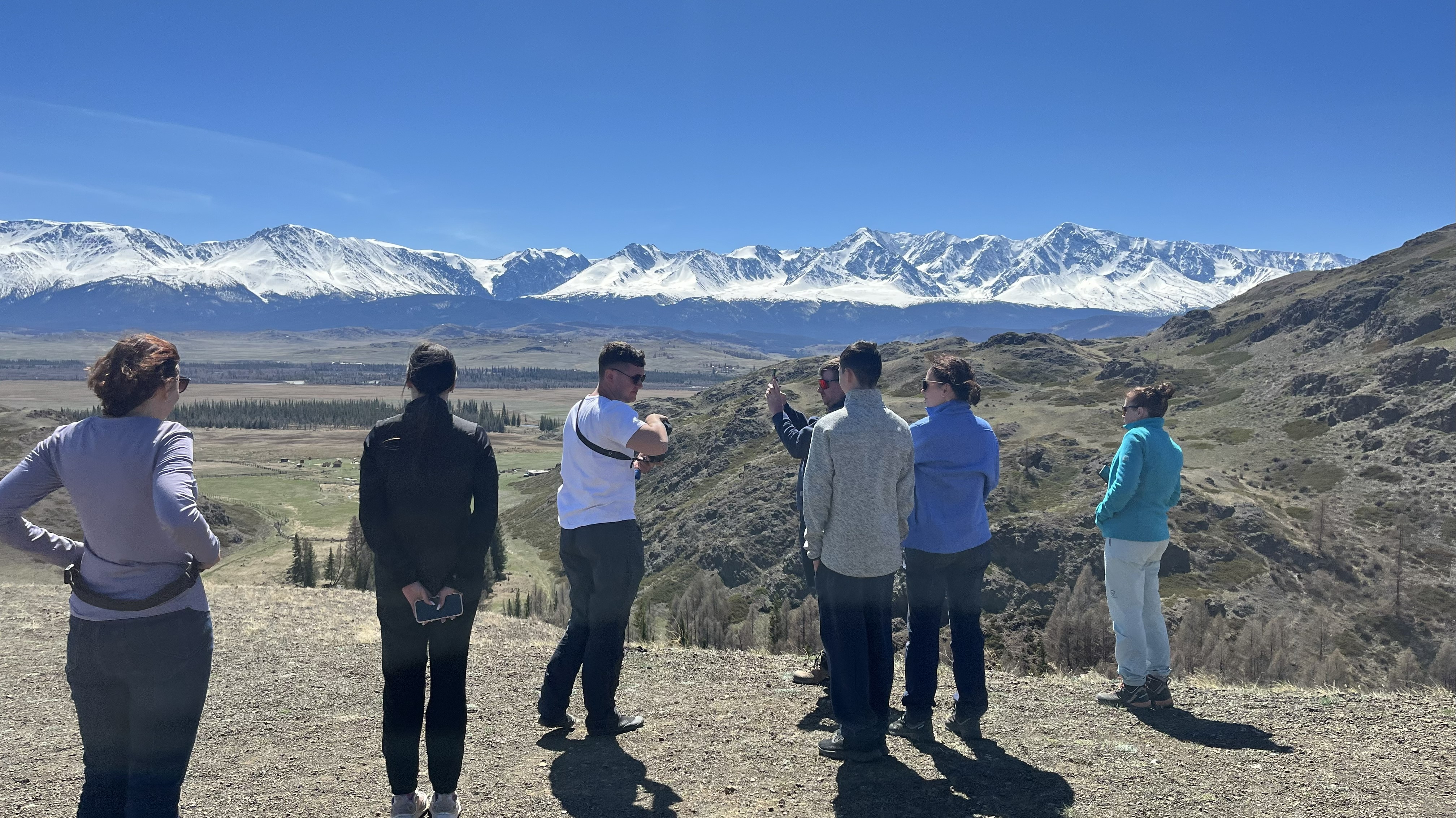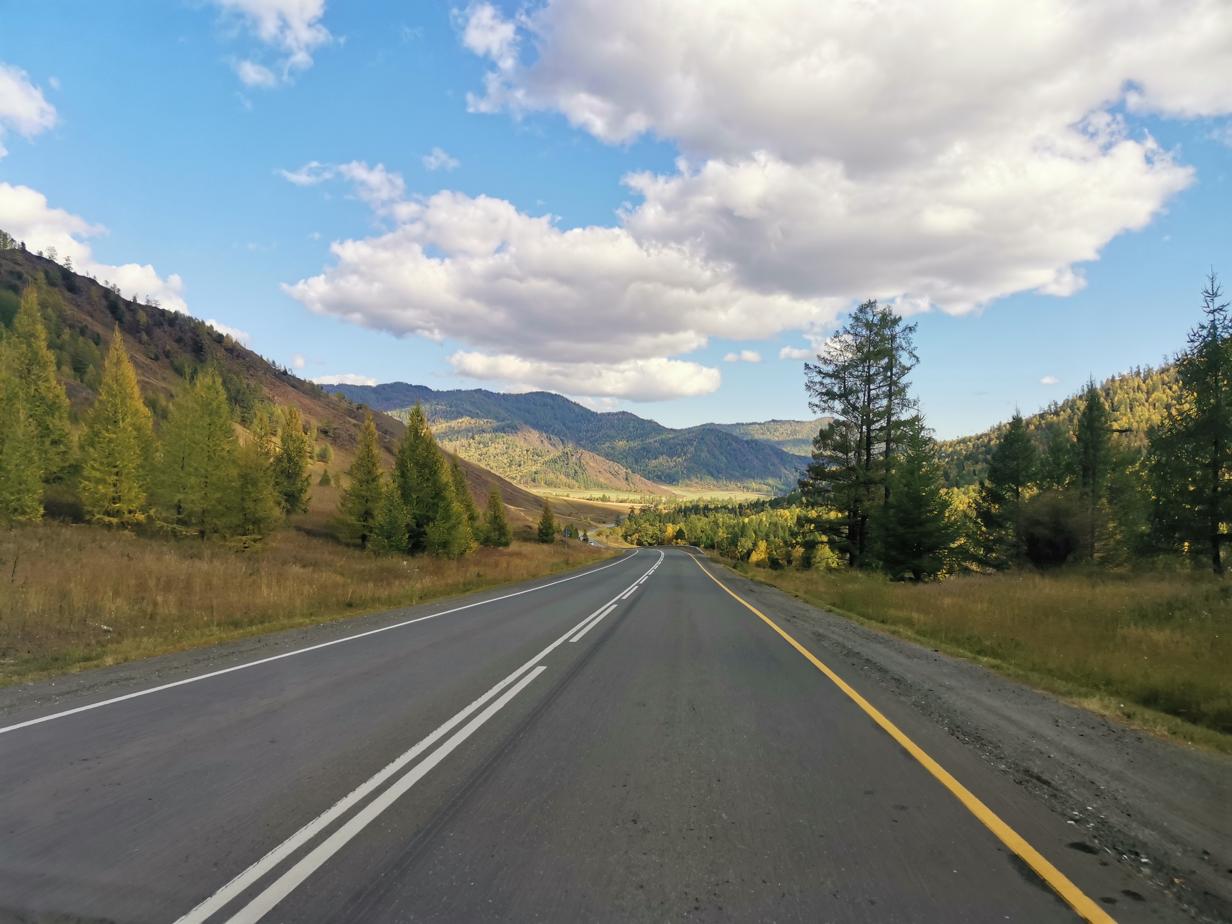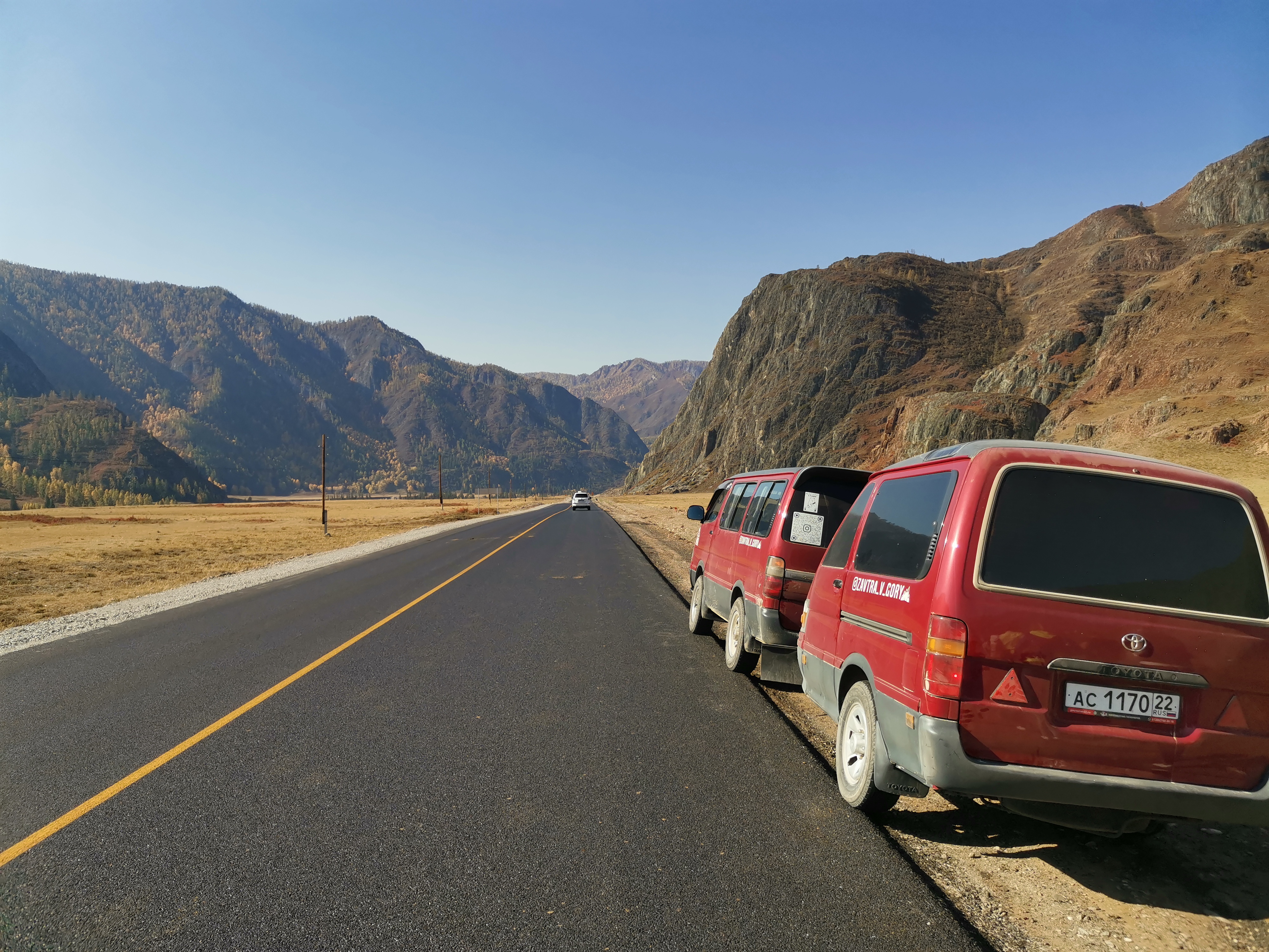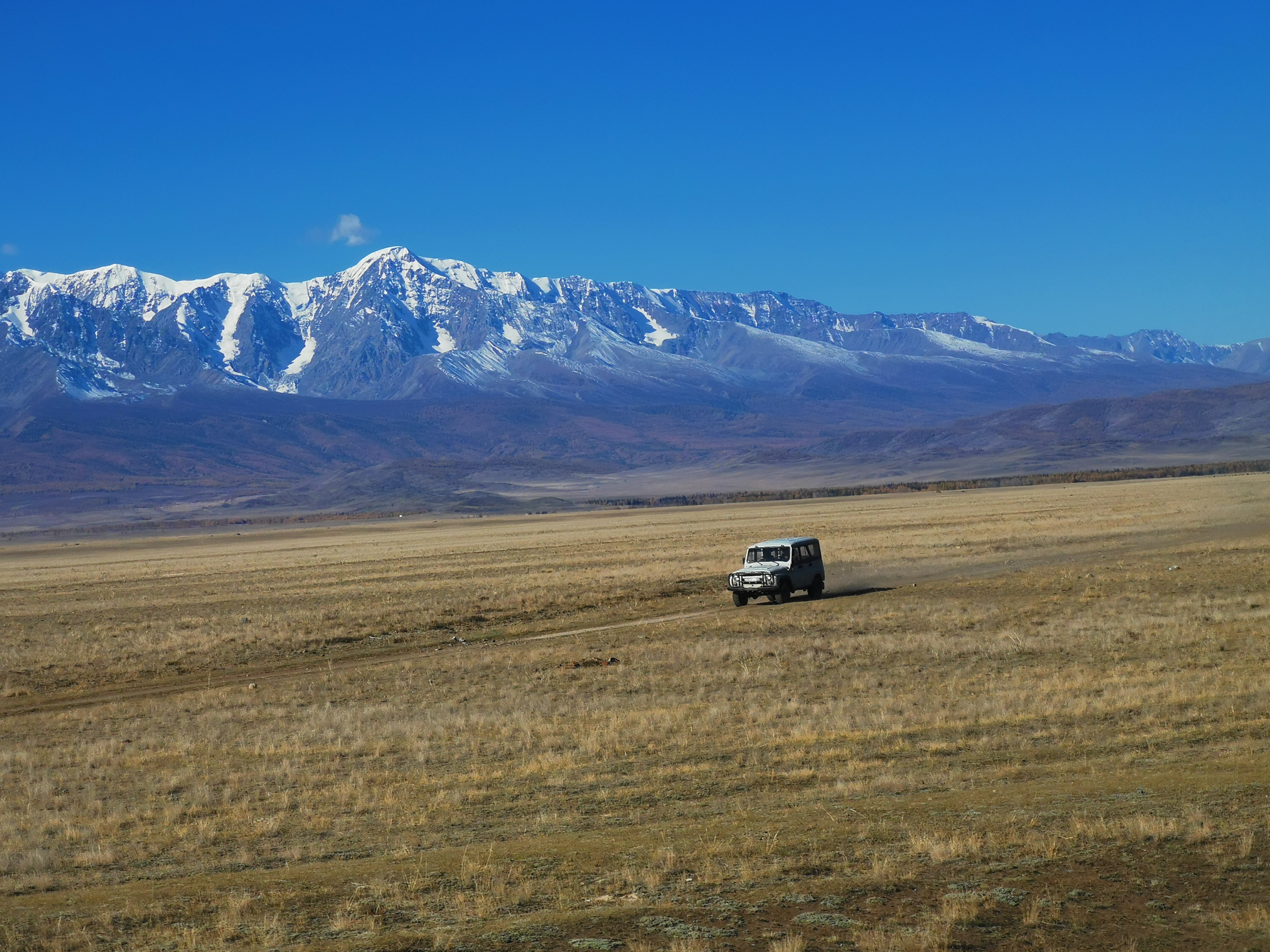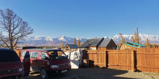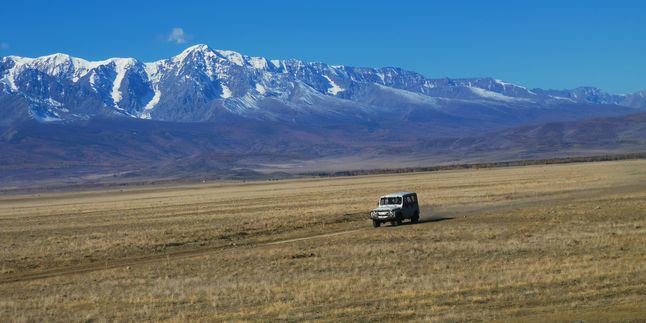 Доезжаем до асфальта и двигаемся дальше по тракту в сторону Монголии. По пути нас ждет потрясающий вид на заснеженные горы Северо-Чуйского хребта и Курайскую котловину.