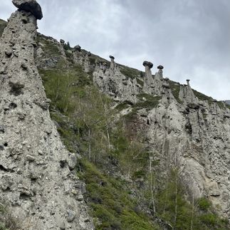 Завтрак и переезд около 30 км ниже по течению р.Чулышман. Наша цель - Каменные грибы урочища Аккурум . Каменные грибы — это один из видов курумов, так называемых скоплений каменных глыб, образовавшихся в результате выветривания и вымывания в месте выхода на поверхность скальных пород. Находятся они на склоне горы, поэтому придётся немного прогуляться в гору. Прогулка займёт около 2.5 часов.