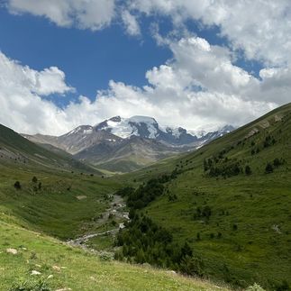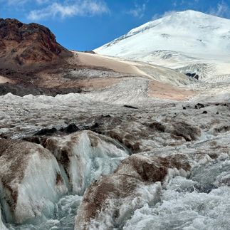 Сегодня нам необходимо перейти вброд реку Кызылкол по малой воде, поэтому встаем очень рано, в 3-4 утра, собираем лагерь, проходим короткий инструктаж и двигаемся в путь. Переход через реку станет одним из самых ярких моментов путешествия: ледяная вода, шум потока, адреналин и ощущение настоящего горного приключения. После переправы немного пройдём, чтобы согреться, а с первыми лучами солнца устроим завтрак на берегу реки. Далее держим путь через урочище Ирахиксырт: бескрайние альпийские луга, где только ветер, горы и простор. Вокруг — застывшие лавовые потоки, хребет Ташлысырт и вечные ледники Эльбруса. Идти легко, а виды захватывают дух. К обеду выходим к легендарной поляне Эммануэля — стартовой точке для всех, кто штурмует Эльбрус с севера. Здесь жизнь бьёт ключом: альпинистские лагеря, палатки, группы туристов. Здесь можно поймать связь, воспользоваться благами цивилизации и почувствовать себя частью большого горного братства. Размещаемся на территории альплагеря, готовим обед, отдыхаем.