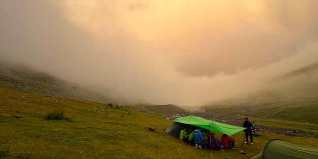 Сегодня нас ждёт спуск к урочищу Джилы-Су — около 9 км вниз, где дыхание цивилизации усиливается: шумные туристы, шоссе, машины. Люди приезжают сюда ради живописных водопадов, лечебных нарзанов и тёплых минеральных ванн, место крайне популярно. Но мы не задерживаемся надолго — впереди Северный Каракайский перевал (2850 м, н/к). Подъём на него лёгкий и приятный: почти весь путь идёт по травянистому склону, хотя и предстоит набрать больше 600 метров высоты. На перевале устраиваем долгую остановку — перекус и отдых с видом на долину реки Исламчат, раскинувшуюся внизу. Отсюда до места ночёвки рукой подать: сорок минут спуска — и вот мы уже разбиваем лагерь, готовим ужин и наконец отдыхаем после насыщенного дня.