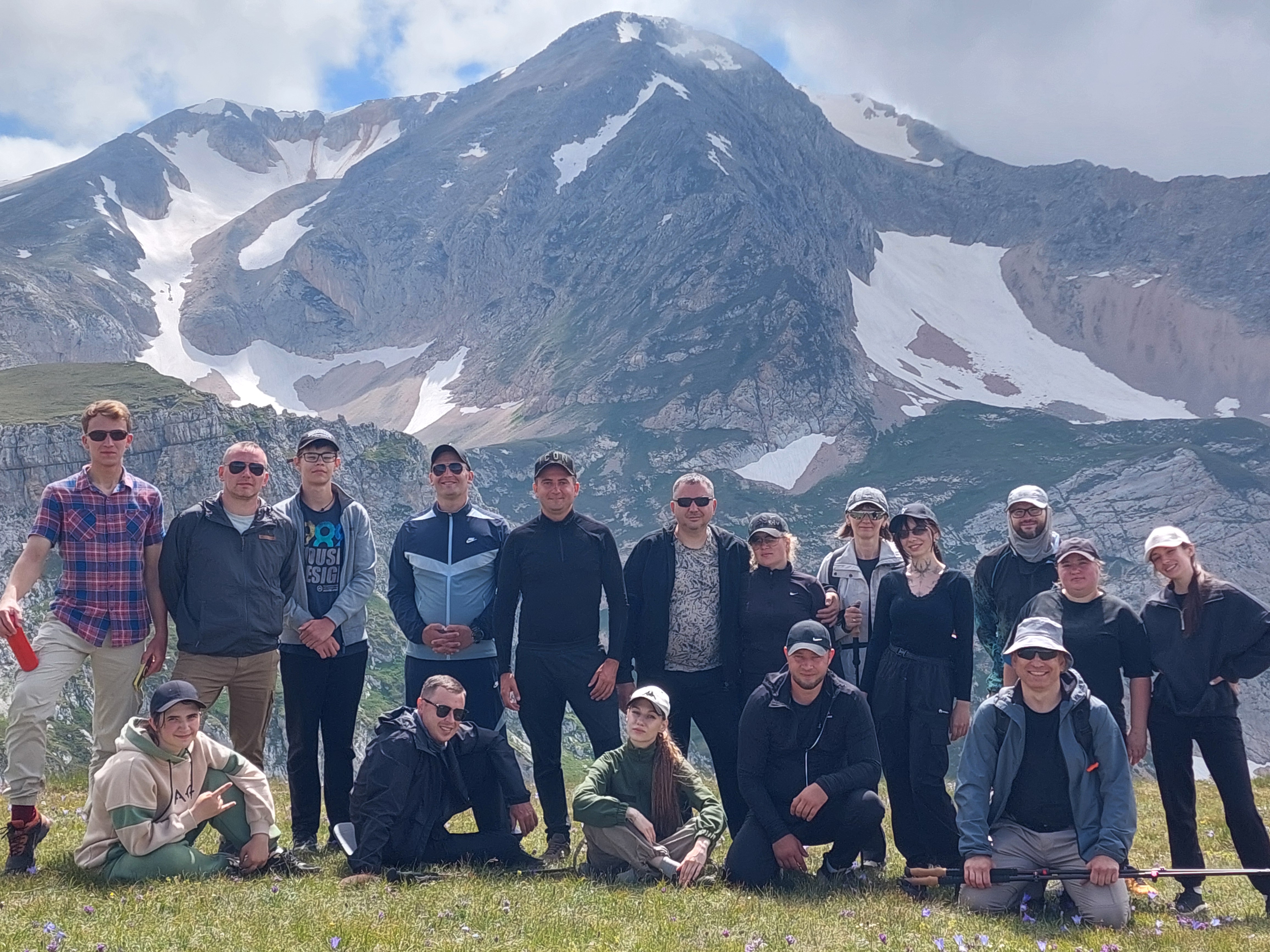 Сегодня мы проснёмся чуть раньше, чтобы взойти на Оштен и ощутить всю горную стихию и головокружительную высоту гор! Потому что в районе полудня на Оштене собираются облака, и чтобы они не мешали нашему обзору, желательно взойти на вершину до 12:00. Почистив зубы и позавтракав, мы берём с собой только самое ценное, и выдвигаемся налегке к главной цели этого похода. Так как наш лагерь стоит на высоте 2050 м, то на этой высоте уже нет высокой растительности, лишь только солнцем залитые зелёные луга. А значит, нашему обзору ничего не мешает. Этот поход по Кавказу просто переворачивает сознание с такой скоростью, что вы даже не успеваете адаптироваться. По пути к красавцу Оштен мы делаем снимки на его фоне, в которые трудно поверить. Психика с трудом обрабатывает происходящую вокруг красоту. С набором высоты постоянно меняются пейзажи. Но с каждым шагом и метром они становятся всё более панорамными и головокружительными. Вот внизу вдали мы видим озеро 8-ое марта, а вот проходим по снежнику и начинаем играть в снежки прямо среди лета. С набором высоты зелень пропадает совсем, и остаются только рваные безжизненные камни, по которым мы поднимаемся с постоянными передышками, попутно делая сюрреалистичные снимки и замирая от окружающей красоты. Командное фото на вершине обязательный элемент фотоотчета. Обеденное время нас настигнет прямо на вершине, а значит, организуем альпинистский обед в виде бутербродов и горячего чая прямо на ней или, если ветрено, то чуть ниже на зелёной поляне.