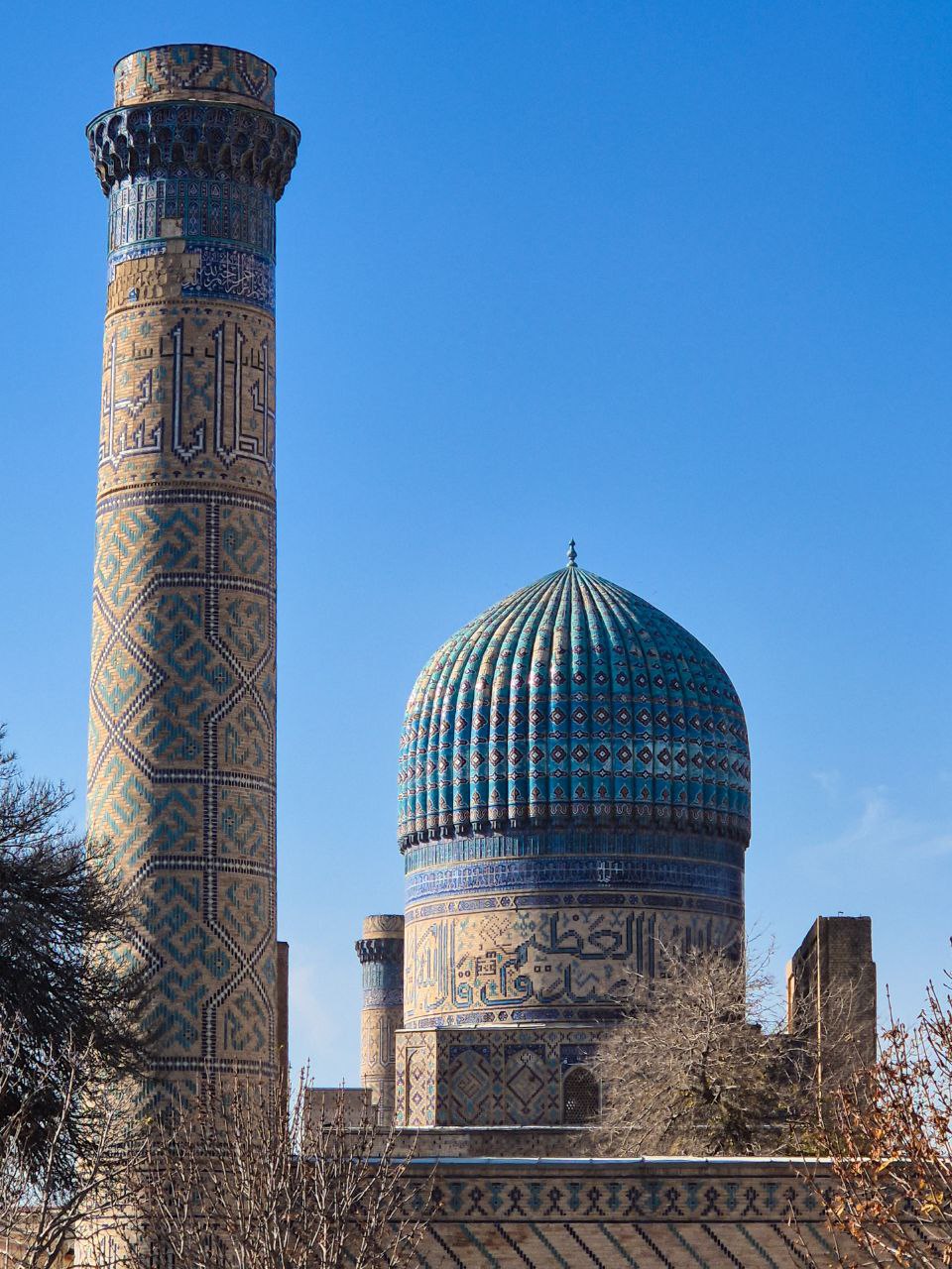 Начнем знакомство с Мавзолея Гур-Эмир семейной усыпальнице династии Тимуридов, где под исполинским лазоревым куполом покоятся сам Тамерлан, его наставники, сыновья и внуки. Это место не очень популярно у туристов из-за мистических легенд о могиле Тамерлана.
