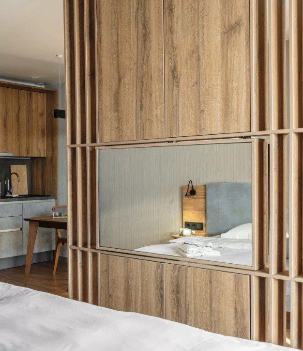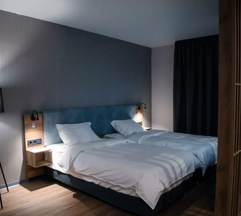 Дом для проживания Карлов двор разделен на две половины, в каждой есть общая кухня, гостиная для гостей. Дом теплый, есть сушилки для одежды. Спальни маленькие, шкафов нет. В нашей спальне был балкон, поэтому все вещи хранились там. Вызывает вопрос отсутствие занавесок в спальне (в нашей их не было). -