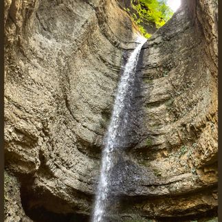 Наслаждаемся видом и переезжаем в верховье Чегема с его знаменитым водопадом Абай-су, который представляет собой не единый мощный поток воды, низвергающийся с высоты 72 м, а множество струй, образующих непрерывный ливень. Дополнительную грациозность создают тысячи устремленных в небо шестигранных колонн. Это скалы, сложенные из столбчатой формы базальта. Общая высота водопада составляет 78 м.