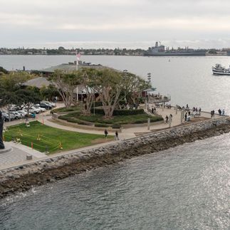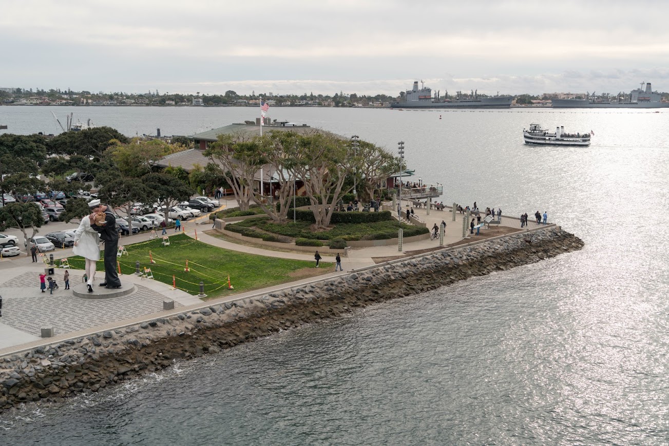 Новый Сан Диего. Набережная, заросшая тремя десятками городских деревьев современных скульпторов. Советская подводная лодка. Старинные парусники. (остановка). Авианосец Мидуэй, для которого Буря в пустыне стала последним боевым походом. (остановка).