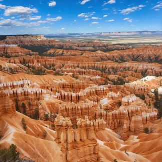 Брайс - это цепь амфитеатров, растянувшаяся на 40 километров на высоте 2700 метров над уровнем моря. Совершенно фантастическое и потрясающее воображение место, главной отличительной особенностью которого являются худу - пальцевидные останки древних скал. Они окрашены в оранжевый, розовый и белый цвета. Трудно поверить в их естественное происхождение. Оказавшись здесь, чувствуешь себя Гулливером, попавшим в страну великанов. Индейское название этого места можно перевести так: Красные скалы, стоящие, подобно людям, в нишах, похожих на вазы. А Брайс фамилия одного из белых первопроходцев. Наиболее удачное время для их фотографирования - на рассвете или закате, когда низкие лучи солнца добавляют контрастность в пейзаж и удивительным образом меняют оттенки скал. Приглядевшись, можно различить диковинные замки с резными окнами, добродушных великанов, царственных особ.