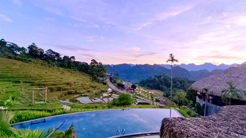 Ночевка в отеле с бассейном с видом на рисовые террасы.