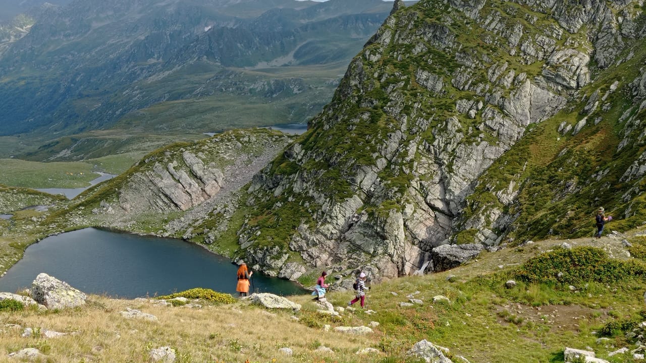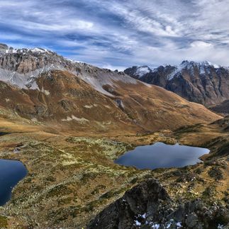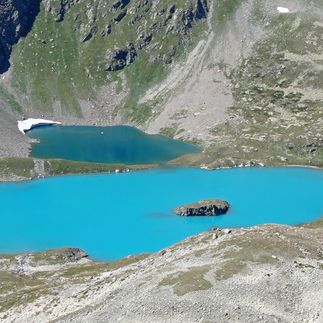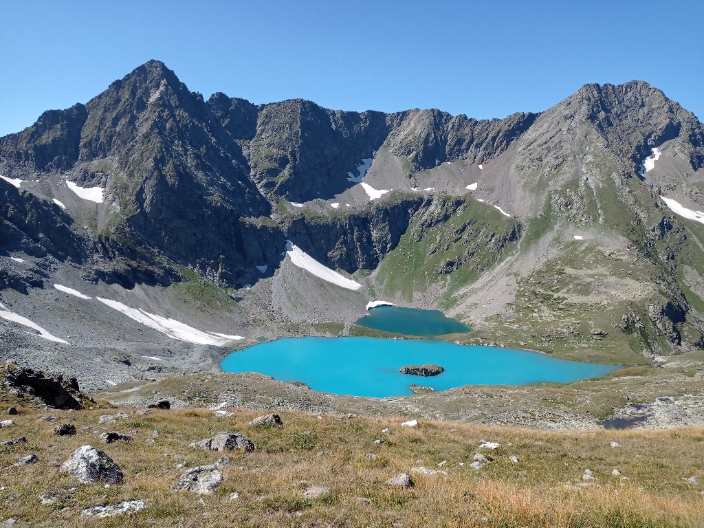 маленьком цирке лежат два красивых озера. По крутой осыпной полочке мы