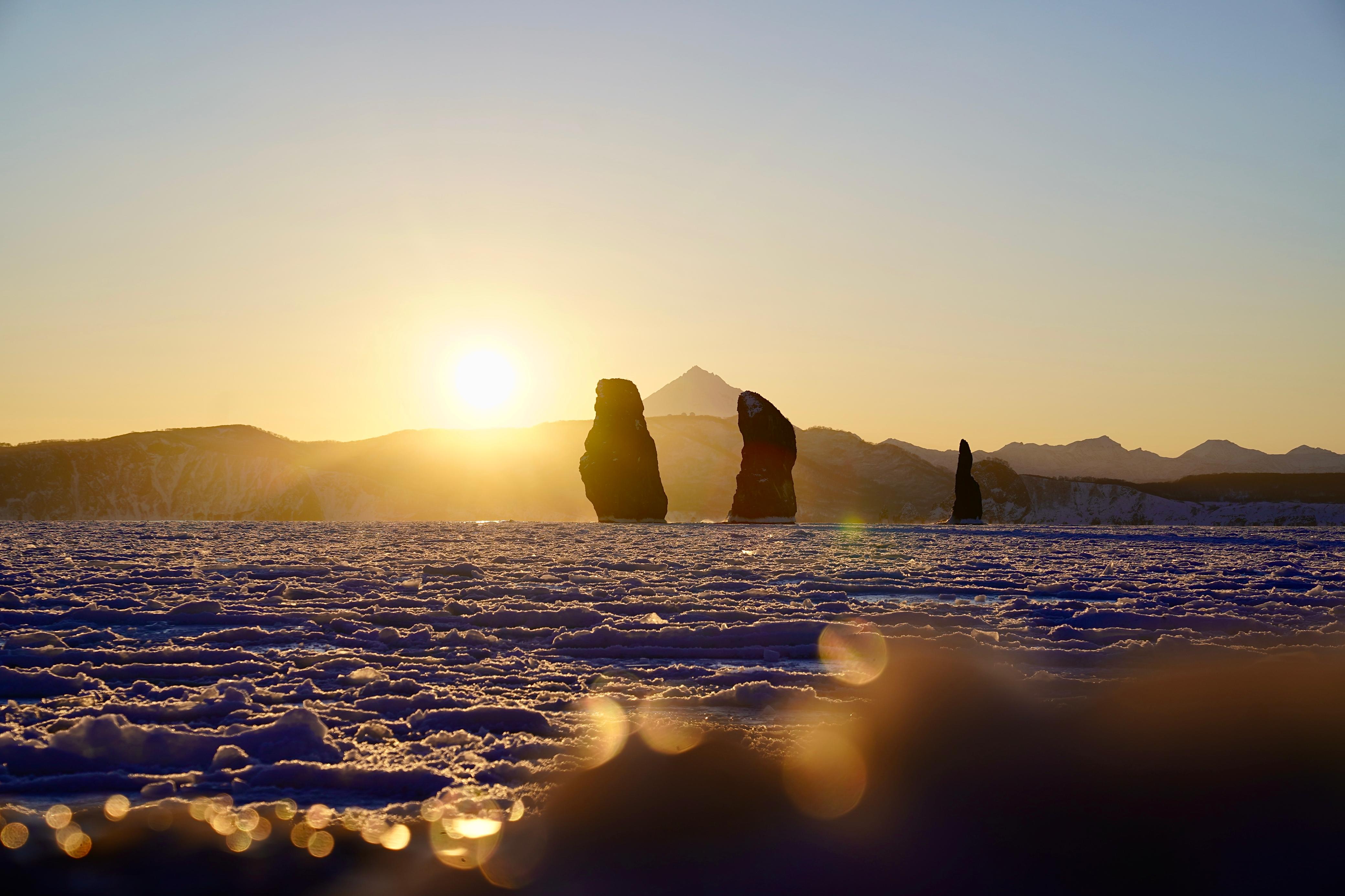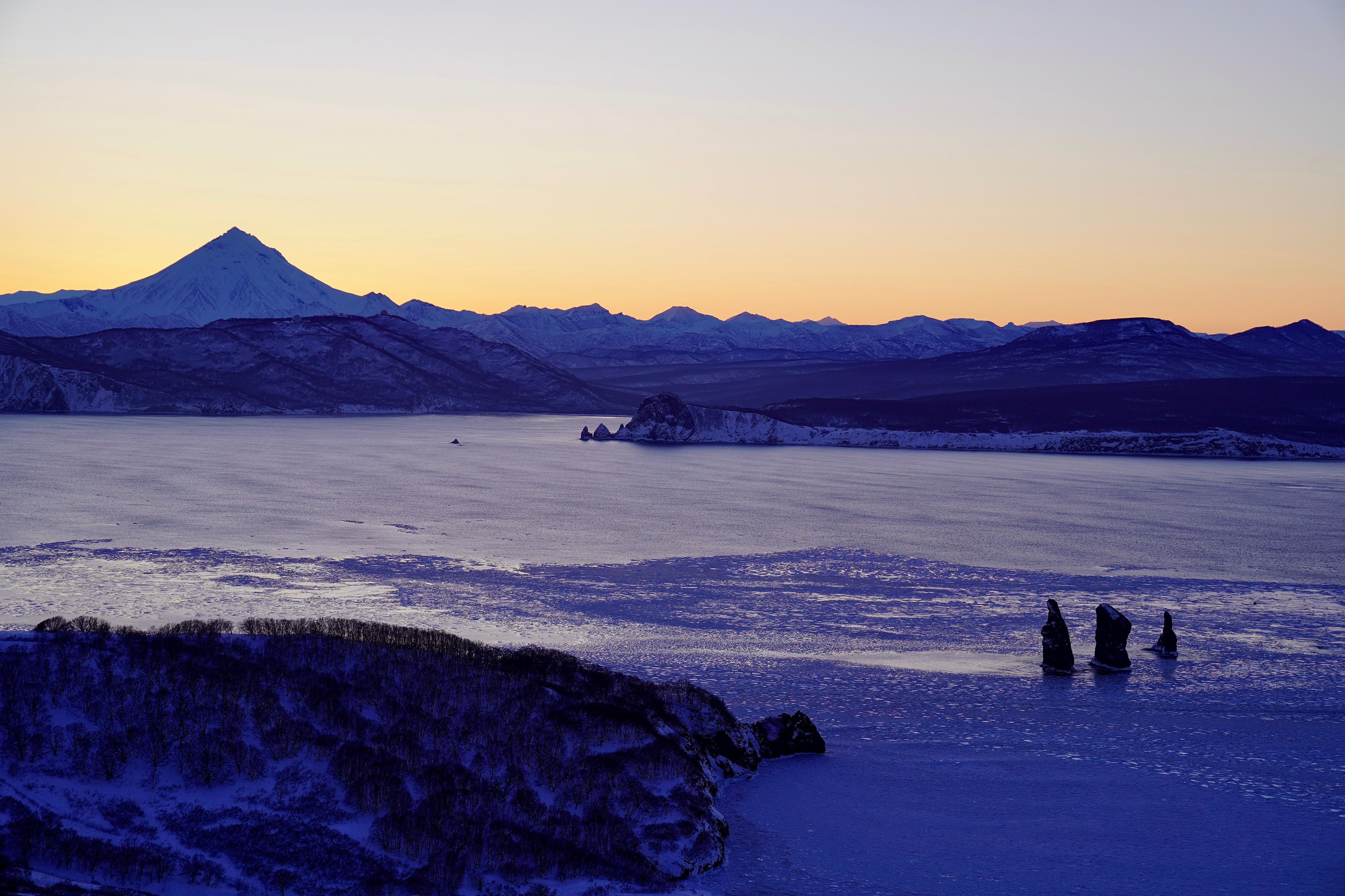 Остановка на смотровой площадке кекуров Три брата — скалистых столбов, покрытых снежной шапкой, создающих величественный силуэт на фоне белоснежных вулканов Вилючинского, Корякского и Авачинского.
