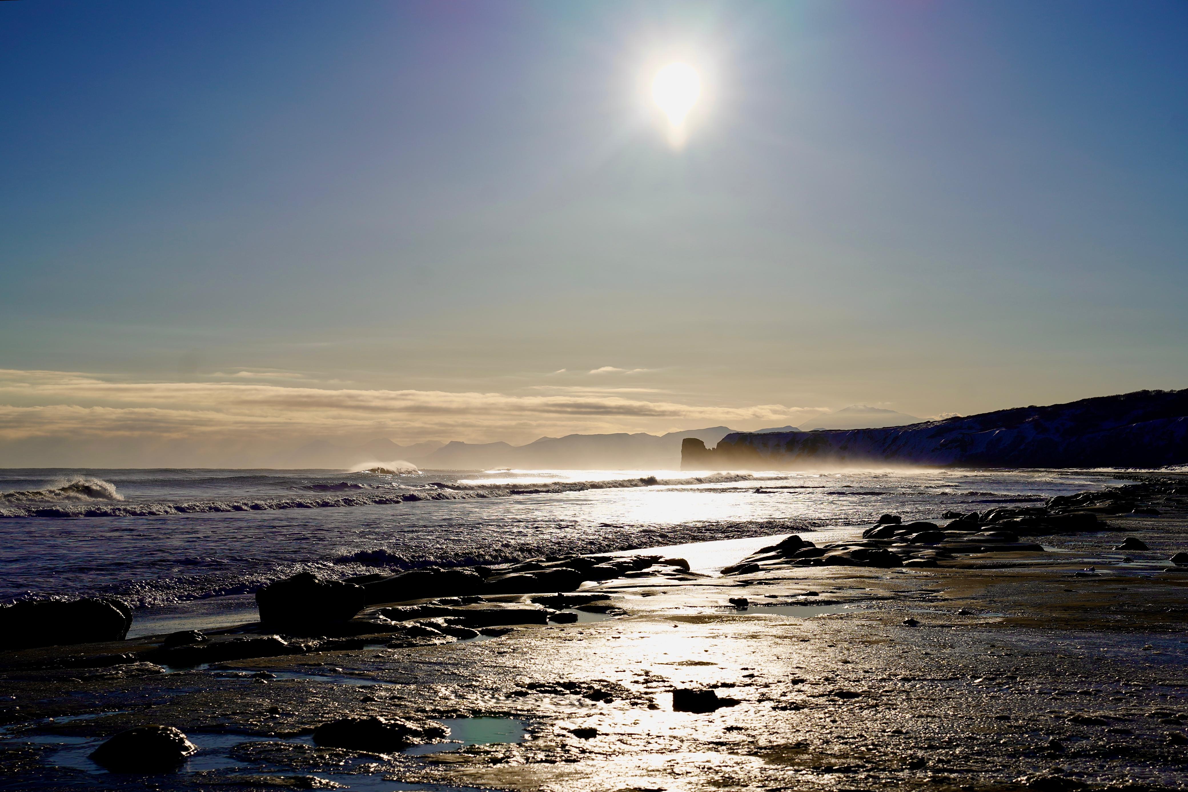 Мыс Маячный зимой превращается в настоящее царство снега и льда у входа в Авачинскую бухту — важный ориентир для кораблей, что входят из сурового Тихого океана. Величественные отвесные скалы, покрытые инеем и снегом, возвышаются над каменистым зимним пляжем.