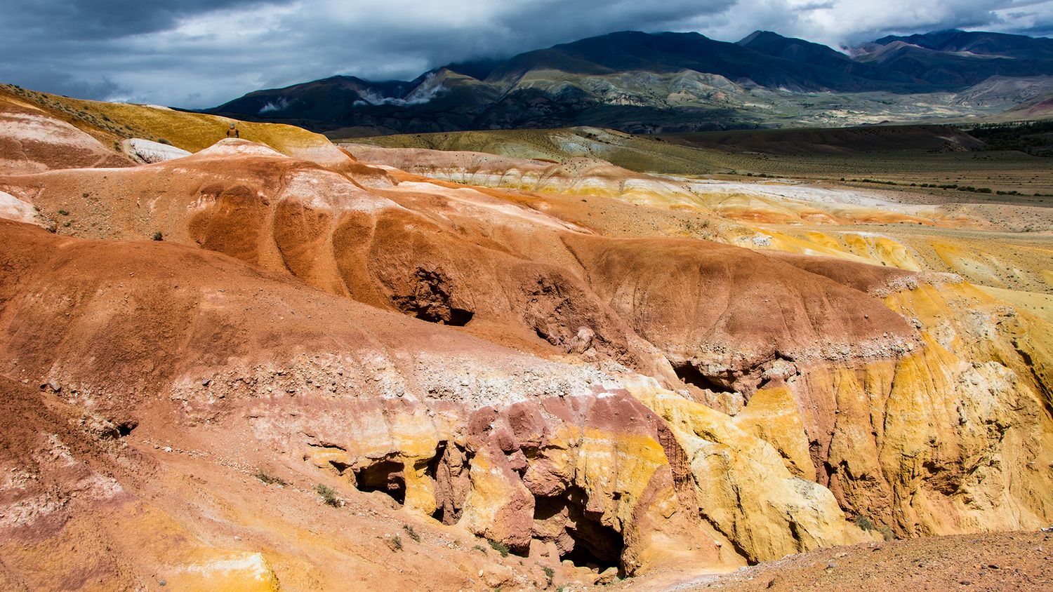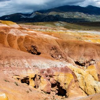 Насладившись видами, двигаемся на Алтайский Марс, место получившее такое название из-за разноцветной глины. Горы здесь как-будто покрашены полосами в разные оттенки красного, желтого и зеленого цвета. Эти фантастические цвета сформировались много миллионов лет назад, когда здесь были мелководные бухты древнего океана. Каждый слой образовался в определенный период и от условий того периода зависело, какой цвет приобретет глина. На разноцветных горах можно видеть, как поработал ветер и талые воды. Выветренные склоны стоят почти вертикальными стенами с колоннами и везде по горам талые воды прорезали бороздки и овраги, создав причудливый рельеф. Здесь стоит побродить и, конечно, пофотографировать !