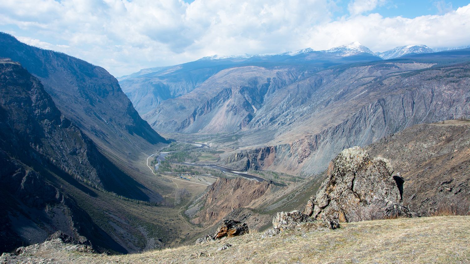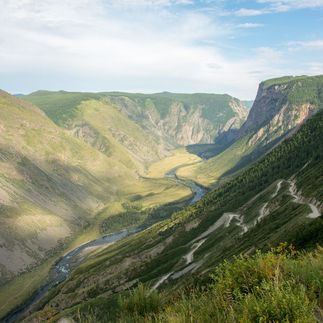 Далее нам предстоит преодолеть перевал Кату-Ярык (с алтайского крутой бугор). Серпантин дороги, вырубленной прямо на склоне горы, спускается в долину Чулышмана. С одной стороны — склон, с другой — обрыв высотой сотни метров. Протяженность спуска — 3,5 км.