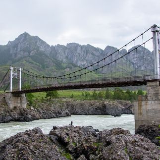 После завтрака едем до Ороктойского моста, построенного над самым глубоким (70 метров) и самым узким (20 метров) местом реки Катунь. Это место также известно под названием Тельдекпенские пороги. Река здесь представляет собой настоящий бурлящий поток, которому откровенно тесно в этом узком коридоре из причудливых чёрных скал. Создаётся ощущение, что энергия реки здесь передаётся любому живому организму.